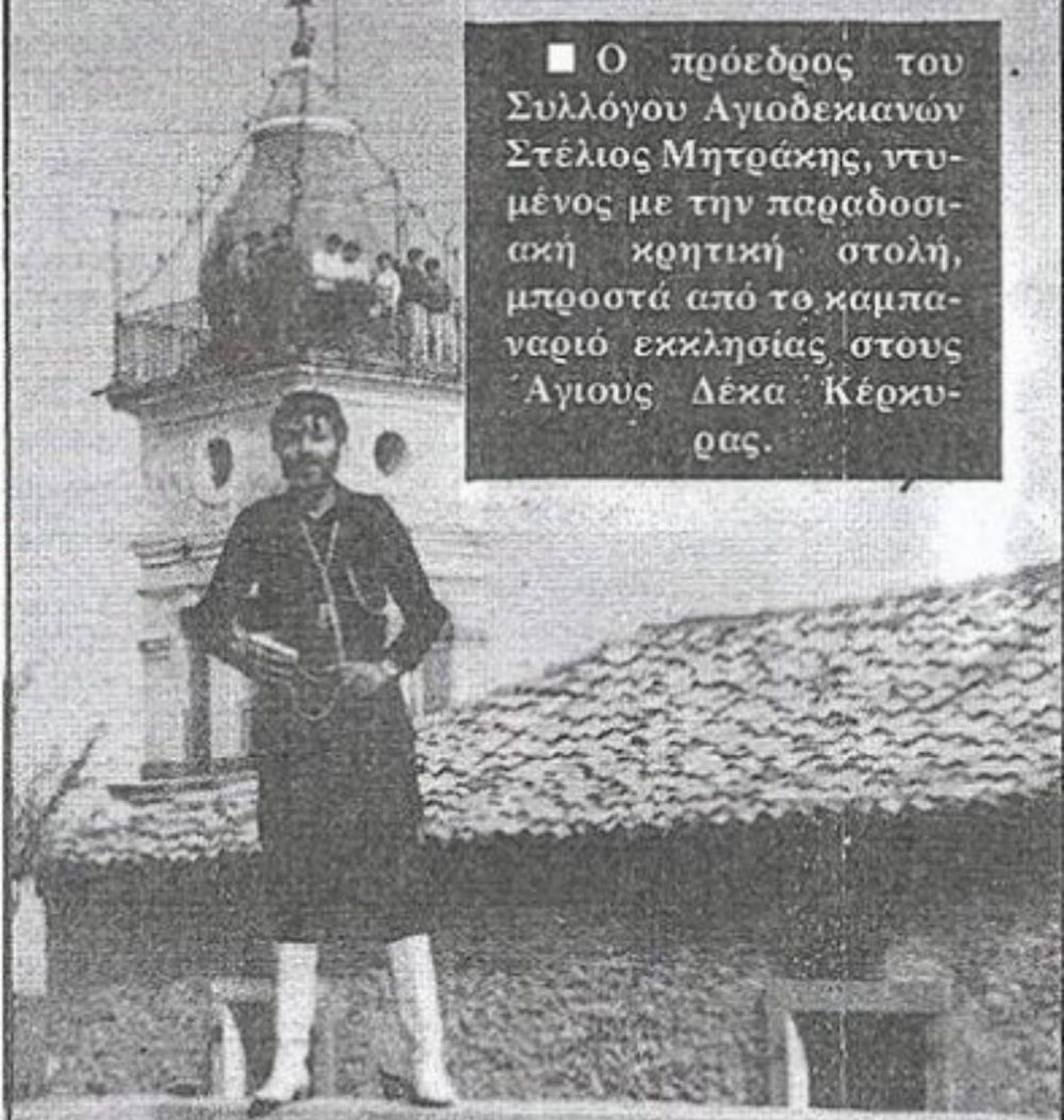 *Στη φώτο ο τότε πρόεδρος του Συλλόγου Αγίων Δέκα Αττικής Στέλιος Μητράκης με παραδοσιακή στολή μπροστά στο καμπαναριό της εκκλησίας στους Αγίους Δέκα Κέρκυρας (αρχείο «Κρητικά Επίκαιρα»)