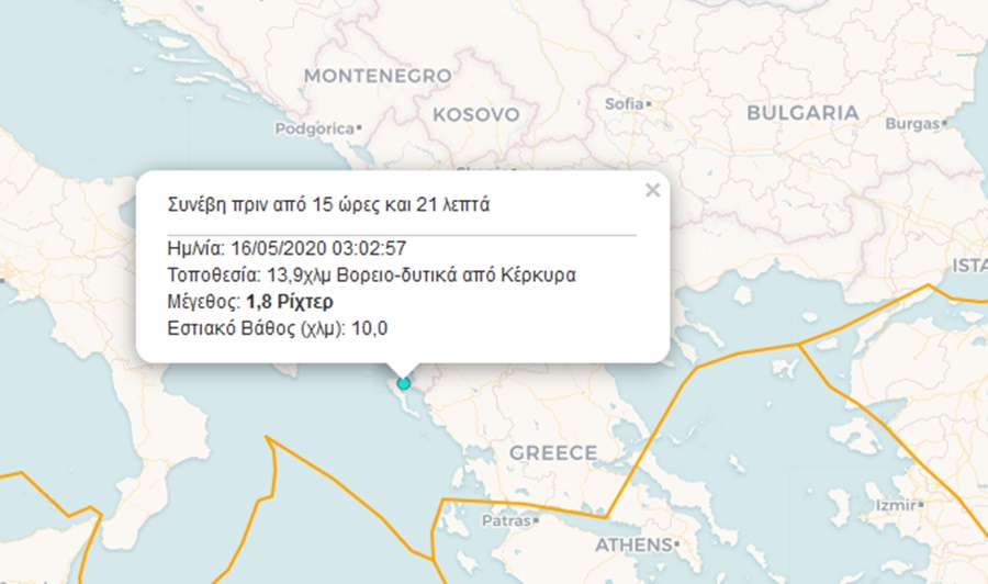 Σεισμική δόνηση εντάσεως 1.8 βαθμών της κλίμακας Ρίχτερ, σημειώθηκε τα ξημερώματα της Κυριακής (στις 03:02) 13,9 χλμ ΒΔ της Κέρκυρας.