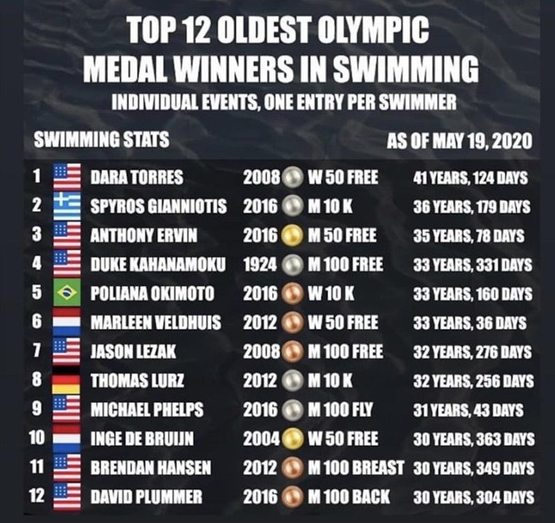 Ο Σπύρος Γιαννιώτης κατέκτησε το ασημένιο μετάλλιο στους Ολυμπιακούς Αγώνες σε ηλικία 36 ετών κα 179 ημερών και είναι ο 1ος άνδρας στη σχετική λίστα όλων των εποχών, ενώ, στο σύνολο γηραιότερη κολυμβήτρια που ανέβηκε στο βάθρο είναι η Ντάρα Τόρες.