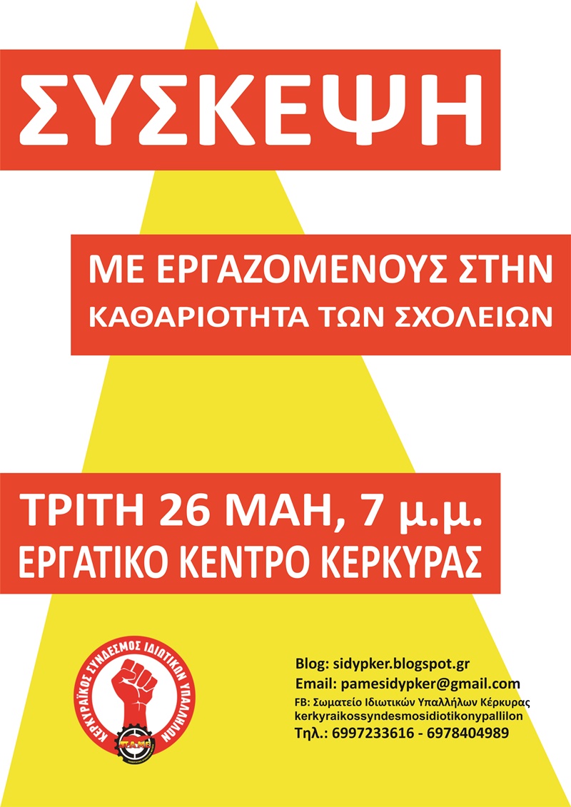 “Κάλεσμα στους εργαζόμενους στην καθαριότητα των σχολείων σε σύσκεψη την Τρίτη 26 Μάη, στις 7 μ.μ. στο Εργατικό Κέντρο Κέρκυρας”.