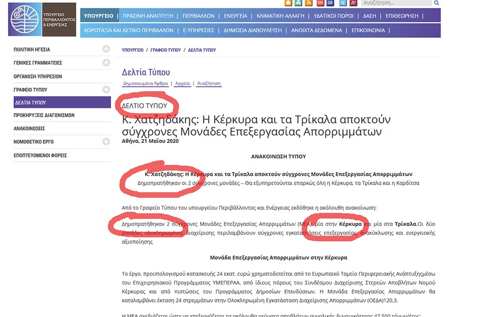 - Έσπευσε να ανακοινώσει ότι το έργο κατασκευής εργοστασίου ολοκληρωμένης διαχείρισης απορριμμάτων Κέρκυρας ήδη δημοπρατήθηκε μαζί με την αντίστοιχη μονάδα στα Τρίκαλα ο Υπουργός Περιβάλλοντος και Ενέργειας, Κωστής Χατζηδάκης την Πέμπτη, αλλά αποκαλύπτεται σήμερα πως αυτό δεν μπορεί να έχει συμβεί, καθώς μια ημέρα μετά, την Παρασκευή, ο ΦΟΣΔΑ με κατεπείγουσα δια περιφοράς συνεδρίαση, ενέκρινε τους όρους της δημοπράτησης.