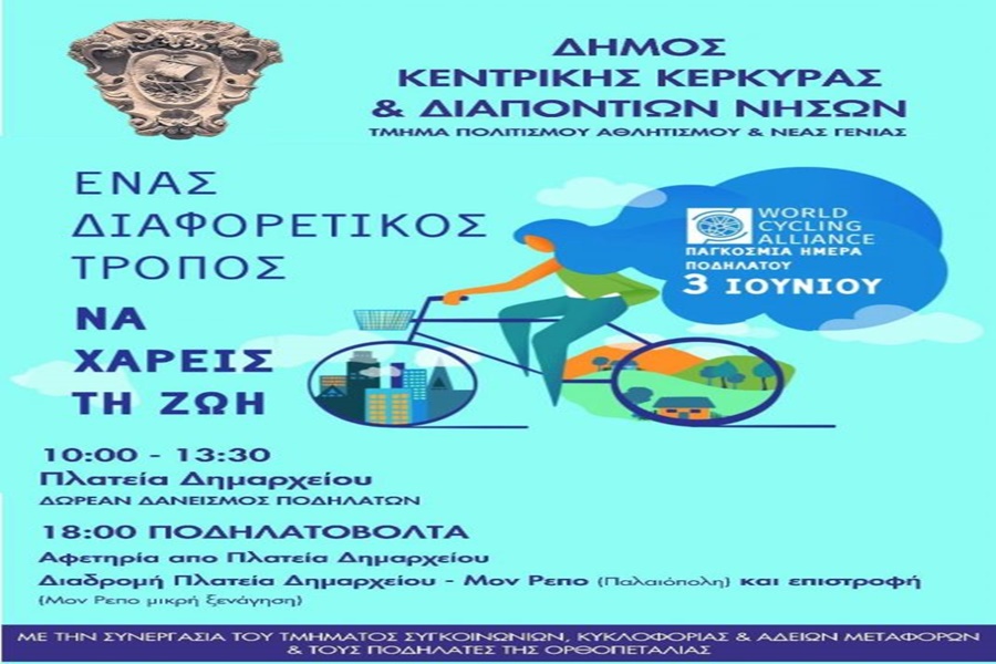 Ο Δήμος Κεντρικής Κέρκυρας και Διαποντίων Νήσων, σας προσκαλεί στις εκδηλώσεις που διοργανώνει για την «Παγκόσμια Ημέρα Ποδηλάτου».