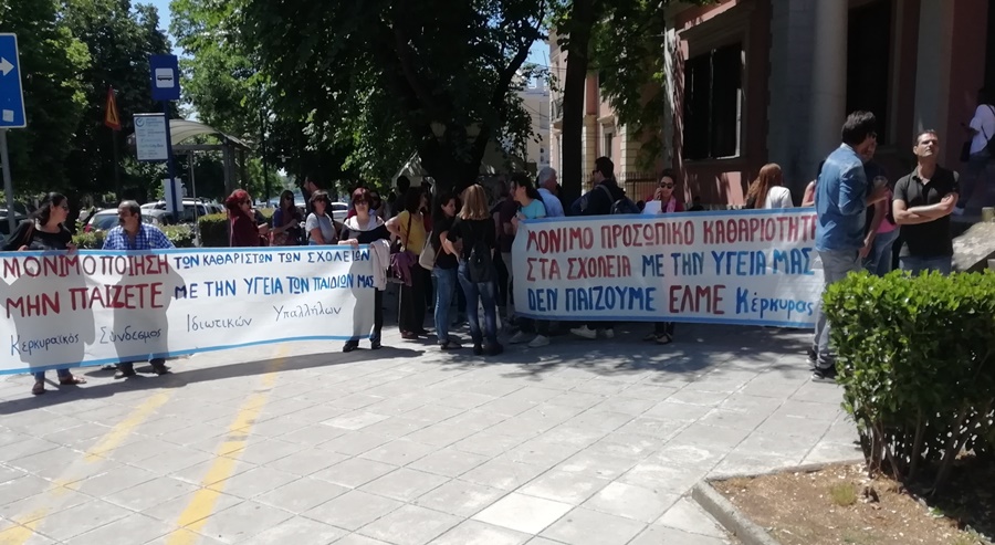 Κινητοποίηση για τα ζητήματα των καθαριστριών οργανώθηκε την Τρίτη με πρωτοβουλία του Κερκυραϊκού Συνδέσμου Ιδιωτικών Υπαλλήλων και συμμετοχή της ΕΛΜΕ Κέρκυρας, του Συλλόγου Διδασκόντων Πρωτοβάθμιας Εκπαίδευσης και της Ένωσης Γονέων και Κηδεμόνων στο δημαρχείο της Κέρκυρας καταγγέλλοντας την απαράδεκτη κατάσταση που επικρατεί στα σχολειά.