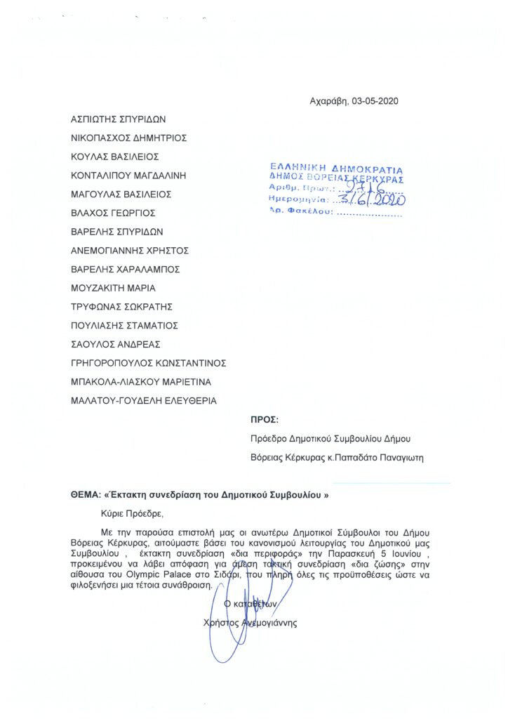Δεκαέξι δημοτικοί σύμβουλοι του δήμου Βόρειας Κέρκυρας ζητούν την άμεση σύγκληση του δημοτικού συμβουλίου δια ζώσης, την Παρασκευή, στο Olympic Palace.