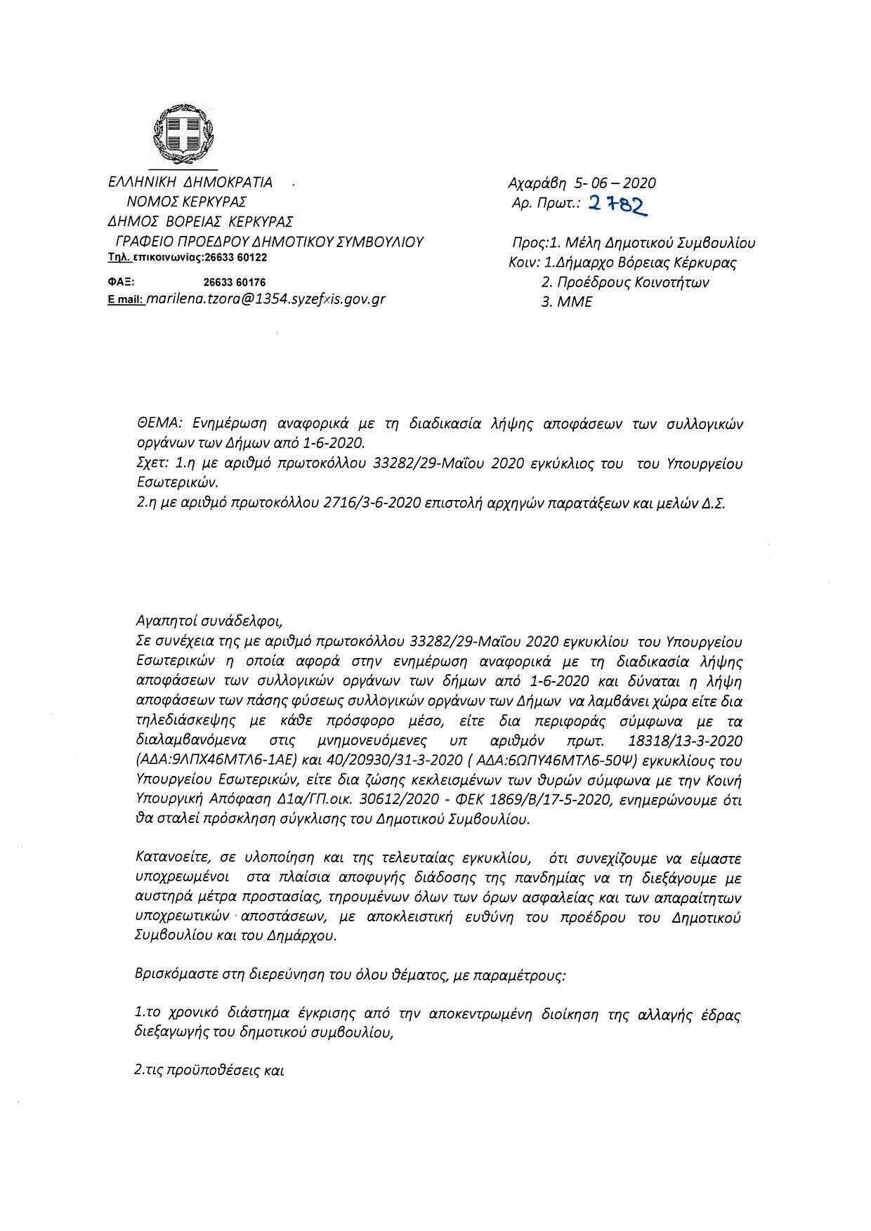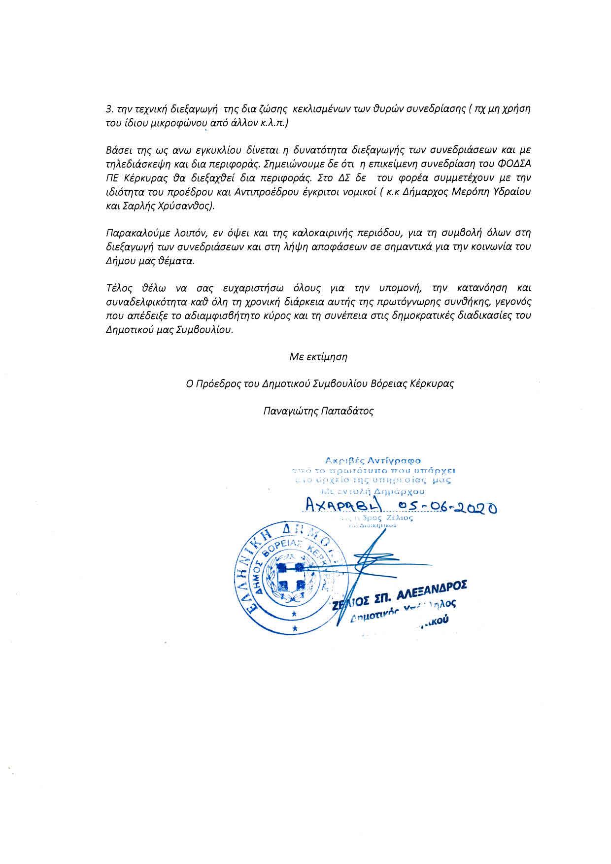 Έγγραφο του προέδρου του σώματος, Παναγιώτη Παπαδάτου, προς τα μέλη του δημοτικού συμβουλίου του βορρά, αναφορικά με τον τρόπο διεξαγωγής των συνεδριάσεων.