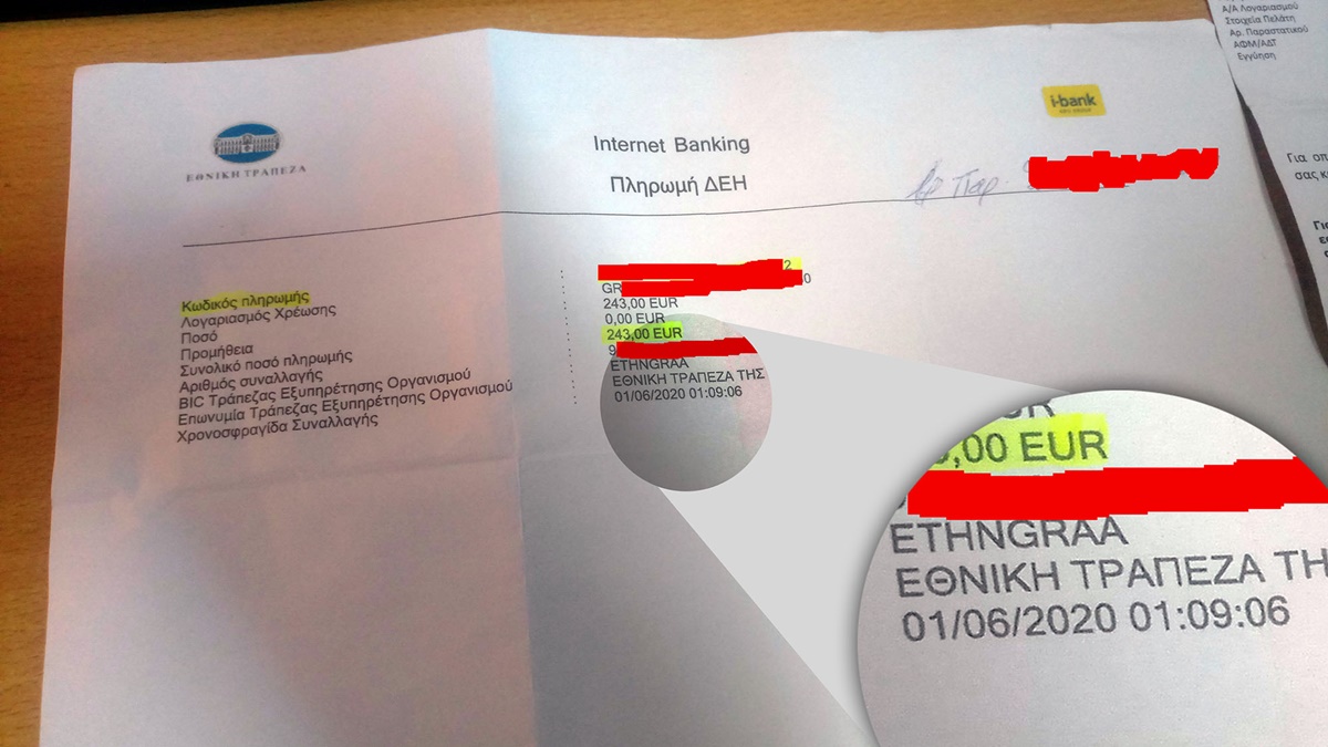 Η πληρωμή του έγινε μέσω internet banking της Εθνικής Τράπεζας στις 13:09 της 1ης Ιουνίου με προθεσμία πληρωμής του τρέχοντος λογαριασμού στις 3 Ιουνίου.