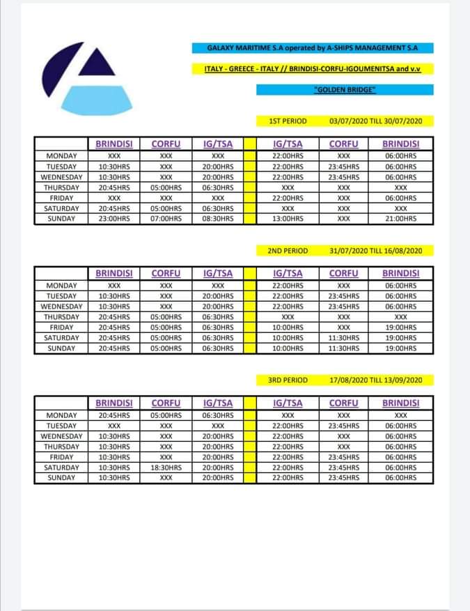 Στην γραμμή Brindisi-Κέρκυρα-Ηγουμενίτσα δρομολογείται από τις 3/7, το GOLDEN BRIDGE, βάση ανάρτησης της A-SHIP MANAGEMENT στα social media.