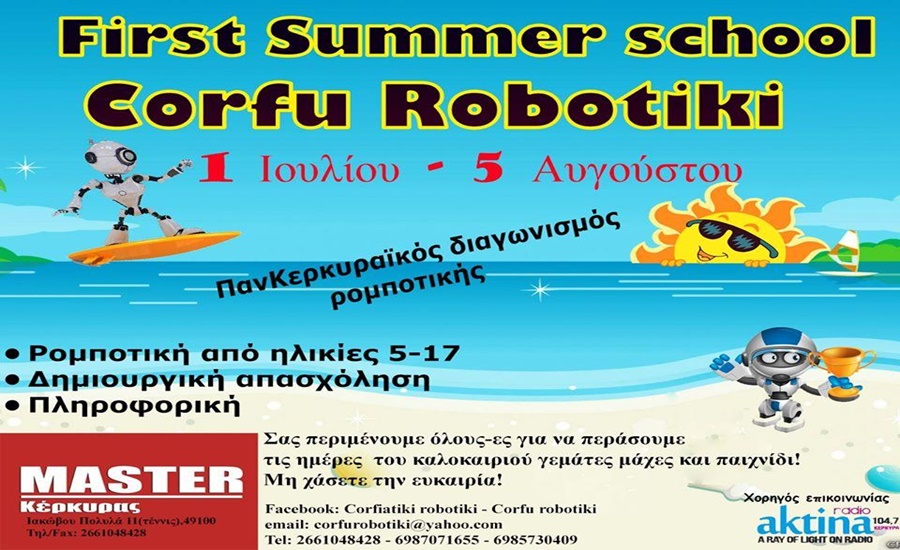 Εγγραφές πραγματοποιούνται στο MASTER KEK Κέρκυρας Ιακώβου Πολυλά 11 (κάτω απο το Τεννις). Λόγω του περιορισμένου αριθμού θέσεων, θα τηρηθεί αυστηρή σειρά προτεραιότητας.Θα τηρηθούν όλα τα μέτρα υγιεινής και ασφάλειας όλων όπως προβλέπετε. Για πληροφορίες και διευκρινίσεις μπορείτε να απευθύνεστε και στα τηλέφωνα, 2661048428, 6987071655 – 6985730409 και στη σελίδα CorfuRobotiki στο Facebook.