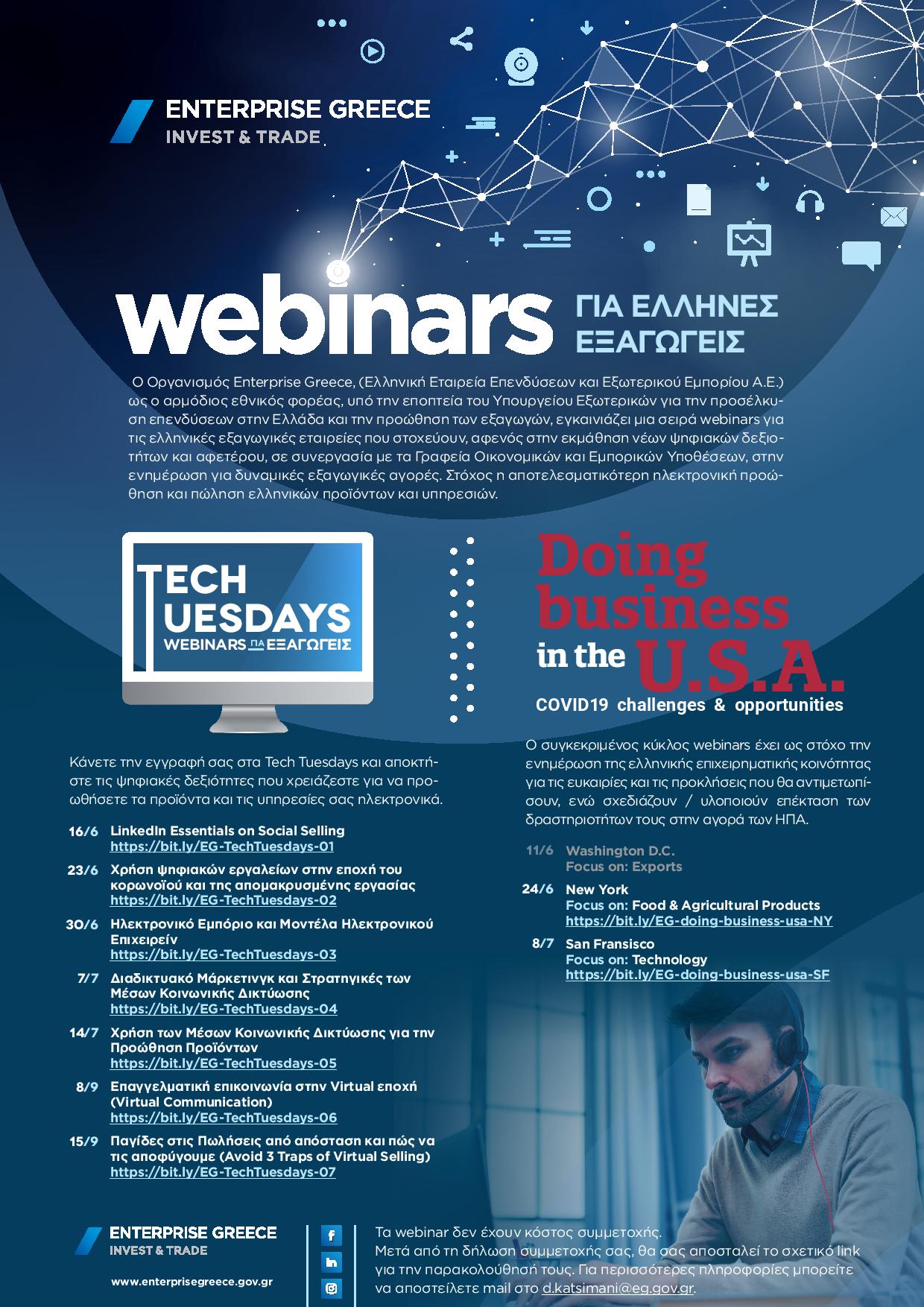 Ο Οργανισμός Enterprise Greece, (Ελληνική Εταιρεία Επενδύσεων και Εξωτερικού Εμπορίου Α.Ε.) ως ο αρμόδιος εθνικός φορέας, υπό την εποπτεία του Υπουργείου Εξωτερικών για την προσέλκυση επενδύσεων στην Ελλάδα και την προώθηση των εξαγωγών, εγκαινιάζει μια σειρά webinars για τις ελληνικές εξαγωγικές εταιρείες που στοχεύουν, αφενός στην εκμάθηση νέων ψηφιακών δεξιοτήτων και αφετέρου, σε συνεργασία με τα Γραφεία Οικονομικών και Εμπορικών Υποθέσεων, στην ενημέρωση για δυναμικές εξαγωγικές αγορές. Στόχος η αποτελεσματικότερη ηλεκτρονική προώθηση και πώληση ελληνικών προϊόντων και υπηρεσιών.