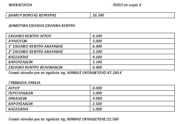 1.Στους επιμέρους τραπεζικούς λογαριασμούς των σχολικών μονάδων του Δήμου Βόρειας Κέρκυρας πιστώθηκαν τα ποσά της γ και δ δόσης έτους 2019 , ύψους 69.680,00 € για την κάλυψη λειτουργικών αναγκών-εξόδων.