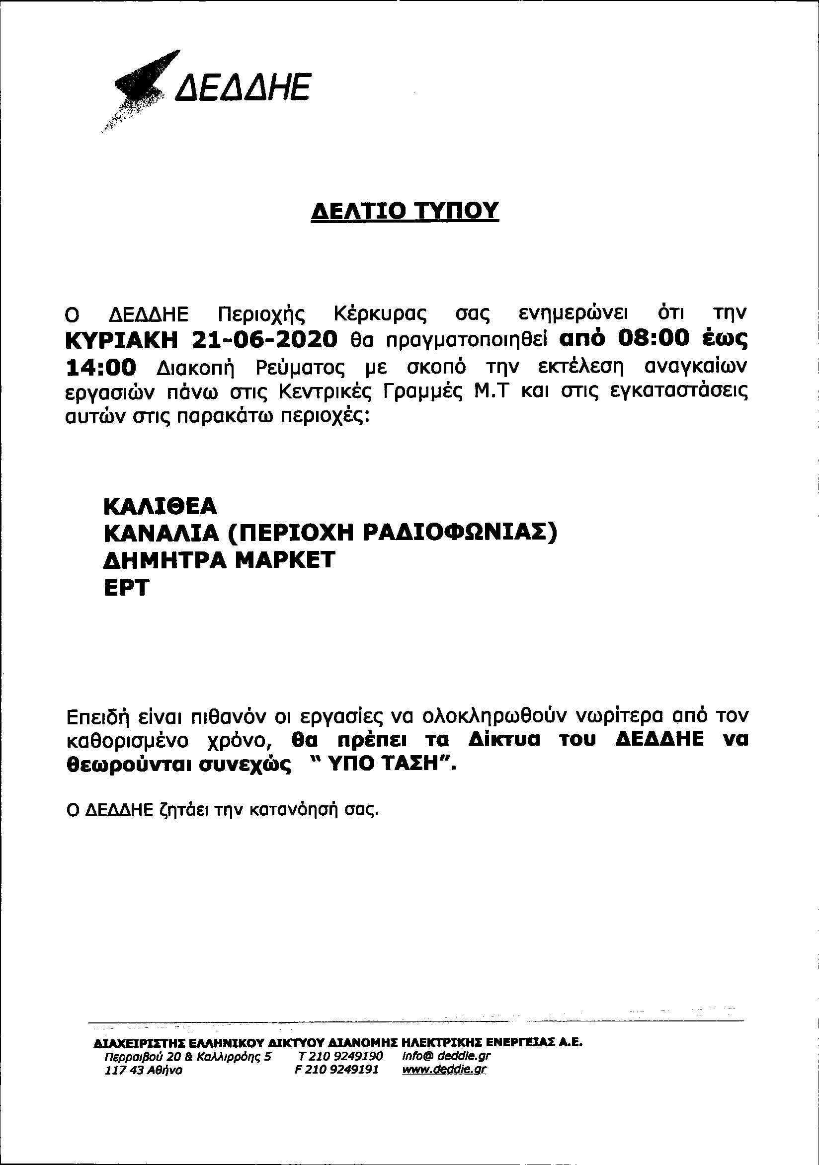 ΚΟΙΝΩΝΙΑΕΛΕΥΘΕΡΟΕΙΔΗΣΕΙΣ Νέες διακοπές ρεύματος Παρασκευή και Κυριακή Για ακόμη μια φορά, θα υπάρξουν διακοπές ρεύματος σε περιοχές της Κέρκυρας λόγω εργασιών. Last updated: 17/06/2020 19:01 CorfuPress.com Published: 17/06/2020 Share SHARE Για ακόμη μια φορά, θα υπάρξουν διακοπές ρεύματος σε περιοχές της Κέρκυρας λόγω εργασιών. ‘ Διακοπή ρεύματος τη Δευτέρα-Δείτε που Που θα γίνει διακοπή ρεύματος την Τετάρτη Που θα γίνει διακοπή ρεύματος την Τετάρτη Που θα γίνουν προγραμματισμένες διακοπές ρεύματος το διάστημα 23-25 Αυγούστου Έρχεται διακοπή ρεύματος στη Βόρεια Κέρκυρα Share This Article Facebook Whatsapp Whatsapp Email Copy Link Print Previous Article Ευχαριστήριο του Σχολείου Δεύτερης Ευκαιρίας Next Article “Ο μεγάλος περίπατος…. των επενδυτών” Δεν υπάρχουν Σχόλια Δεν υπάρχουν Σχόλια Αφήστε μια απάντηση Ακύρωση απάντησηςΗ ηλ. διεύθυνση σας δεν δημοσιεύεται. Τα υποχρεωτικά πεδία σημειώνονται με *Σχόλιο * Όνομα * Email * Ιστότοπος Αποθήκευσε το όνομά μου, email, και τον ιστότοπο μου σε αυτόν τον πλοηγό για την επόμενη φορά που θα σχολιάσω. ΑναζήτησηΑναζήτησηRecent PostsΌλα τα μάτια στον Θοδωρή, τον καπετάνιο μας! Τη Δευτέρα 22 Σεπτεμβρίου γιορτάζει… Σαν Σήμερα 22/9: Τα σημαντικότερα γεγονότα… Η πρόγνωση του καιρού Έφηβοι Ιονίου: Με περίπατο, συνεχίζουν στο Rising Stars! Recent CommentsΧωρίς σχόλια για εμφάνιση.