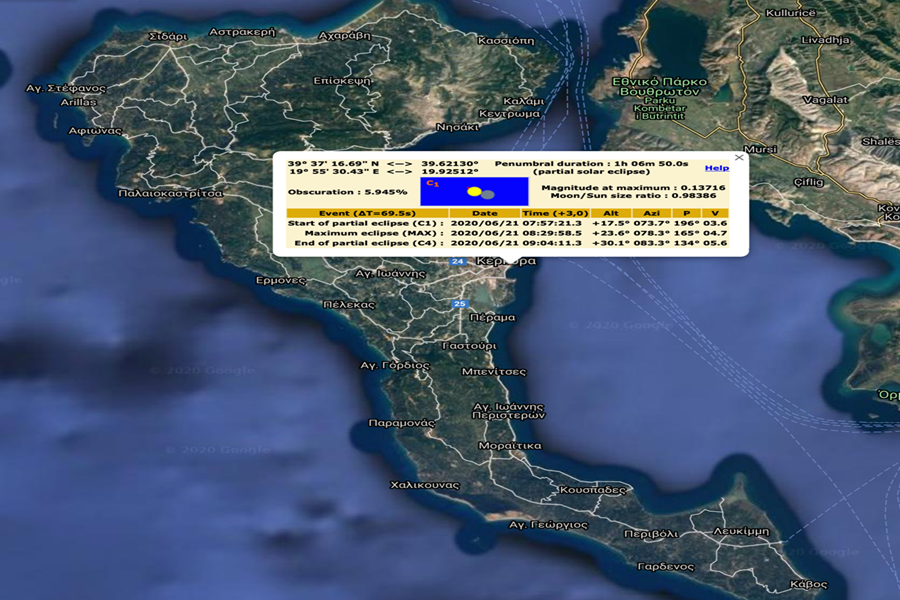 Για την Κέρκυρα, η έκλειψη θα αρχίσει γύρω στις 7:57 και θα τελειώσει στις 09:04 με μέγιστο στις 8:30,
