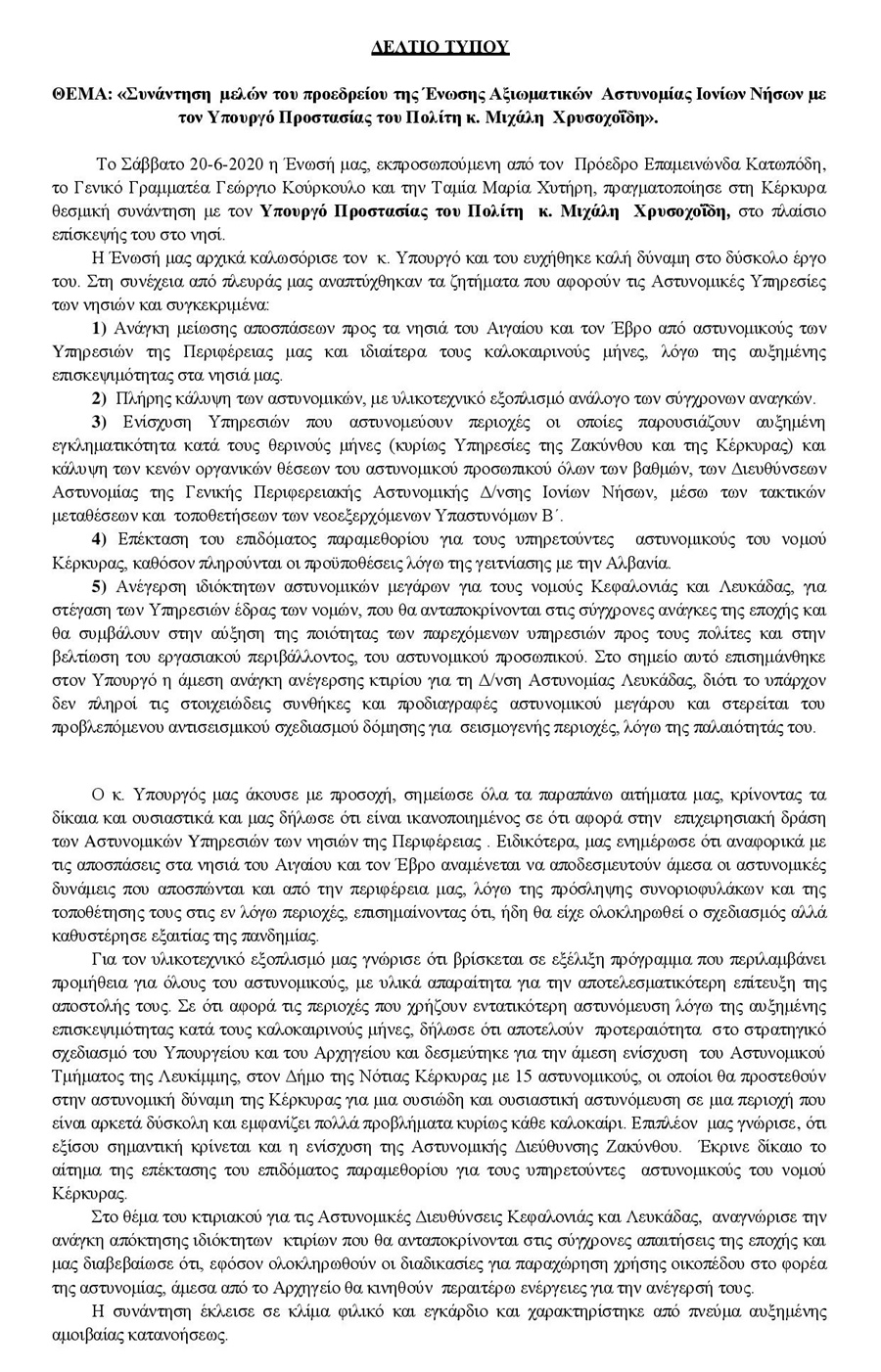 Αντιπροσωπεία της Ένωσης Αξιωματικών Αστυνομίας Ιονίων Νήσων συναντήθηκε με τον Υπ. Προστασίας του Πολίτη στην Κέρκυρα.