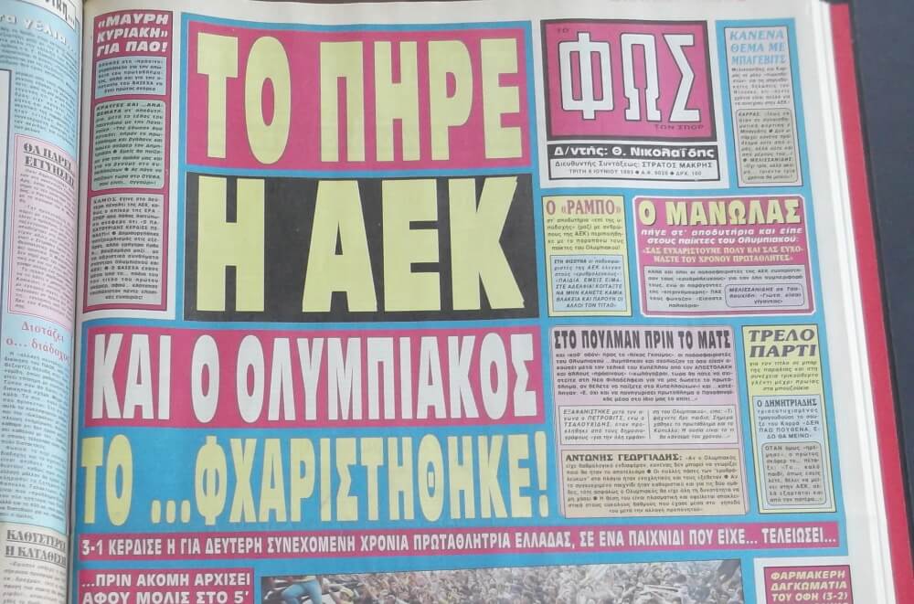 Α, και σημαντικό: παίζουν Ιούνιο μήνα για πρώτη φορά από το 1993, όταν (6 Ιουνίου, τότε) η ΑΕΚ νικούσε τον Ολυμπιακό και έπαιρνε το πρωτάθλημα σε ένα αλήστου μνήμης ματς… Τελευταία αγωνιστική της Α’ Εθνικής και, τότε, η ΑΕΚ ήθελε τη νίκη για να κατακτήσει μαθηματικά το πρωτάθλημα, με τον Παναθηναϊκό να είναι σε απόσταση αναπνοής και να παίζει με την Παναχαϊκή στο… Καραϊσκάκη. Η ομάδα του Ντούσαν Μπάγεβιτς επικράτησε με 3-1 και κατέκτησε ένα ακόμη πρωτάθλημα, ούσα μπροστά στο σκορ με δύο γκολ από το 5ο λεπτό! Ο Τύπος της εποχής στάθηκε σε δημοσιεύματα του στυλ «H AEK το πήρε, ο Ολυμπιακός το… φχαριστήθηκε» ή ότι «ο Ολυμπιακός δεν είχε καμία διάθεση να την… κακοκαρδίσει» ενώ αρκετοί θυμούνται τον Τσαλουχίδη να γελάει όταν μείωνε το σκορ…