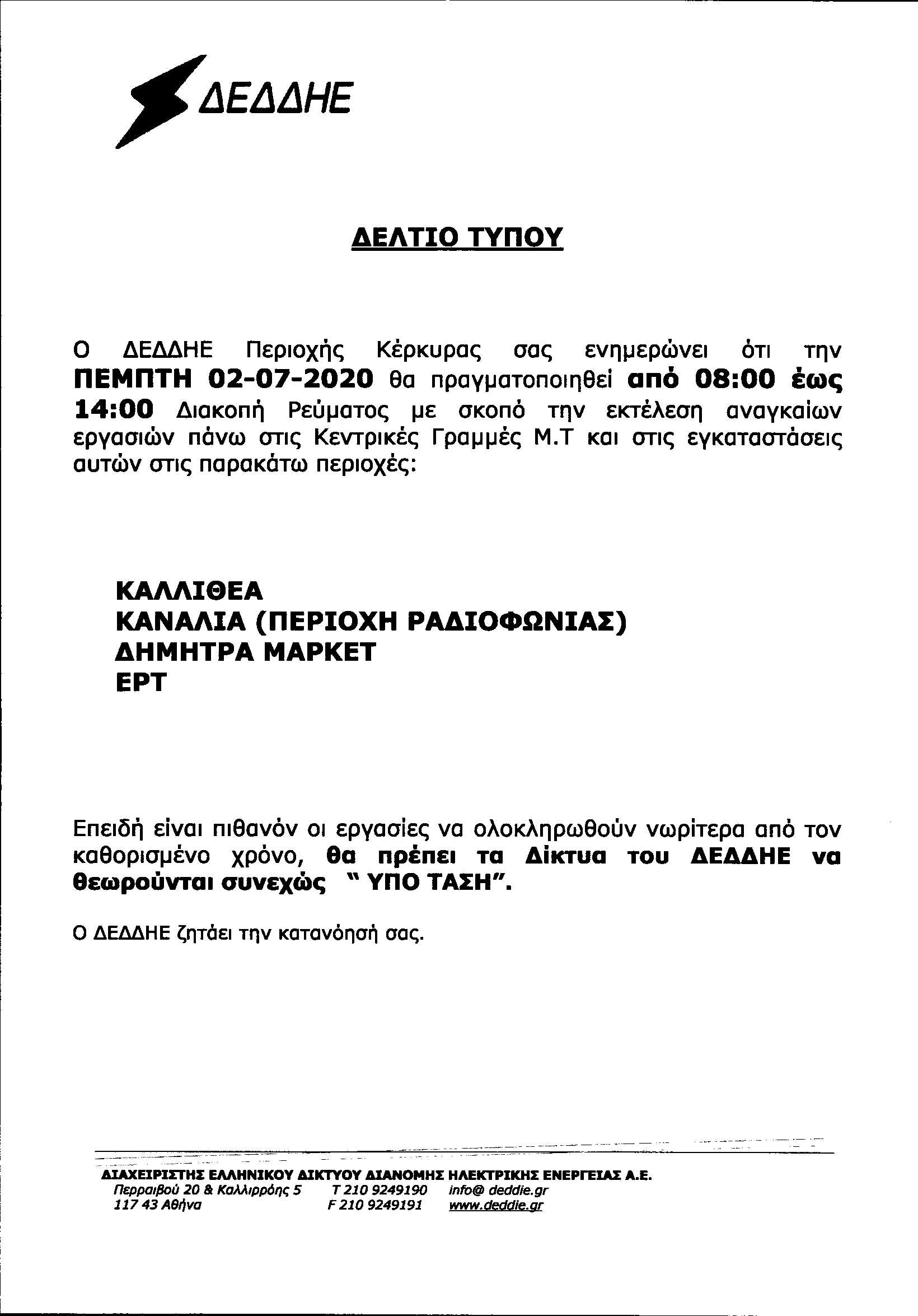 ΚΟΙΝΩΝΙΑΕΛΕΥΘΕΡΟΕΙΔΗΣΕΙΣ Έρχεται νέα διακοπή ρεύματος στα Κανάλια Η διακοπή θα διεξαχθεί την Πέμπτη το πρωί, λόγω εργασιών του ΔΕΔΔΗΕ. Last updated: 30/06/2020 14:53 CorfuPress.com Published: 30/06/2020 Share SHARE Η διακοπή θα διεξαχθεί την Πέμπτη το πρωί, λόγω εργασιών του ΔΕΔΔΗΕ. Διακοπή ρεύματος τη Δευτέρα-Δείτε που Που θα γίνει διακοπή ρεύματος την Τετάρτη Που θα γίνει διακοπή ρεύματος την Τετάρτη Επιστολή Επιμελητηρίου προς ΔΕΔΔΗΕ για τις πολύωρες διακοπές ρεύματος Που θα γίνουν προγραμματισμένες διακοπές ρεύματος το διάστημα 23-25 Αυγούστου Share This Article Facebook Whatsapp Whatsapp Email Copy Link Print Previous Article Έφυγε απ’ τη ζωή ο Διονύσης Ηλίας, συλλυπητήρια απ’ τον ΔΣΚ Next Article Πολλές οι παρεμβάσεις από τα συνεργεία Καθημερινότητας του Δήμου (pics) Δεν υπάρχουν Σχόλια Δεν υπάρχουν Σχόλια Αφήστε μια απάντηση Ακύρωση απάντησηςΗ ηλ. διεύθυνση σας δεν δημοσιεύεται. Τα υποχρεωτικά πεδία σημειώνονται με *Σχόλιο * Όνομα * Email * Ιστότοπος Αποθήκευσε το όνομά μου, email, και τον ιστότοπο μου σε αυτόν τον πλοηγό για την επόμενη φορά που θα σχολιάσω. ΑναζήτησηΑναζήτησηRecent PostsΌλα τα μάτια στον Θοδωρή, τον καπετάνιο μας! Τη Δευτέρα 22 Σεπτεμβρίου γιορτάζει… Σαν Σήμερα 22/9: Τα σημαντικότερα γεγονότα… Η πρόγνωση του καιρού Έφηβοι Ιονίου: Με περίπατο, συνεχίζουν στο Rising Stars! Recent CommentsΧωρίς σχόλια για εμφάνιση.