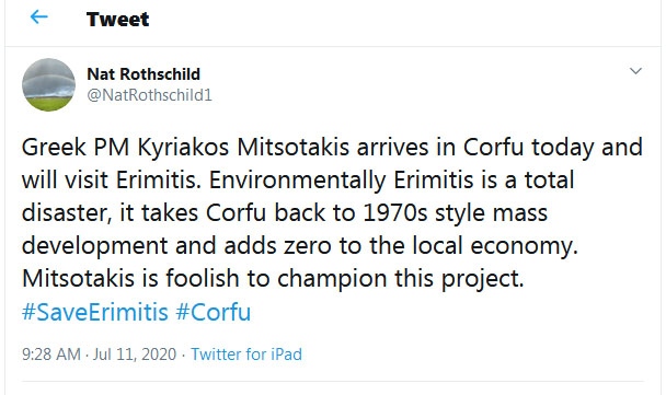 Μάλιστα, στις αναρτήσεις του υποστηρίζει ότι η παρέμβαση που επιχειρείται στον Ερημίτη αποτελεί μία απόλυτη καταστροφή που φέρνει την Κέρκυρα πίσω στη μαζική ανάπτυξη τύπου δεκαετίας ΄70 και δεν προσφέρει τίποτα στην τοπική οικονομία!