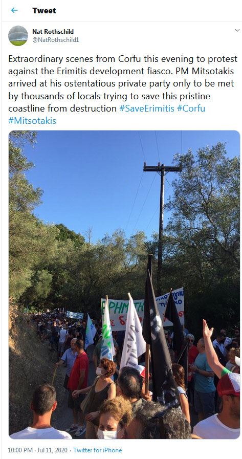 Η παρέμβασή του έρχεται ως συνέχεια σε επιστολή στον Κυριάκο Μητσιτάκη (σε δραματικούς τόνους) που είχαν υπογράψει περισσότεροι από 200 Βρετανοί οι οποίοι έχουν επενδύσει τα τελευταία χρεόνια στην Κέρκυρα ποσά μεγαλύτερα των 100 εκατομμυρίων ευρώ! Στην επιστολή τους έκαναν λόγο για καταστροφή της υπεραξίας της βορειοανατολικής Κέρκυρας αν προχωρήσει η οικοπεδοποίηση και «αξιοποίηση» του Ερημίτη από την NCH!