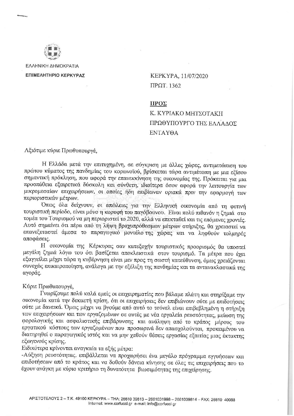 Ο Πρόεδρος του Επιμελητηρίου Κέρκυρας κατέθεσε επιστολή προς τον Πρωθυπουργό κατά την επίσκεψη του τελευταίου στο νησί των Φαιάκων.