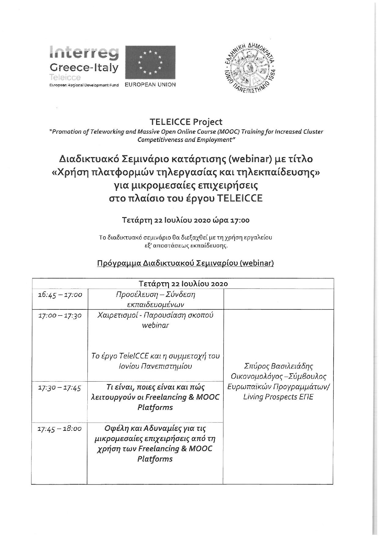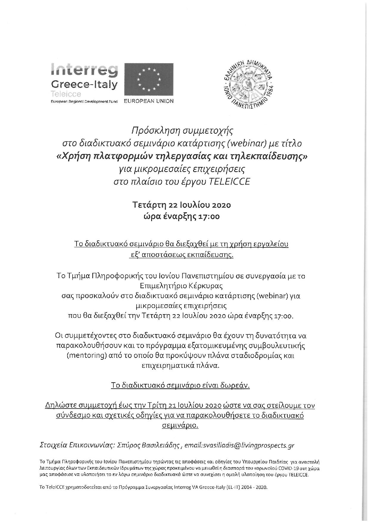 Διαδικτυακό Σεμινάριο κατάρτισης (webinar) με τίτλο «Χρήση πλατφορμών τηλεργασίας και τηλεκπαίδευσης» για μικρομεσαίες επιχειρήσεις στο πλαίσιο του έργου TELEICCE την Τετάρτη 22 Ιουλίου 2020 ώρα 17:00.