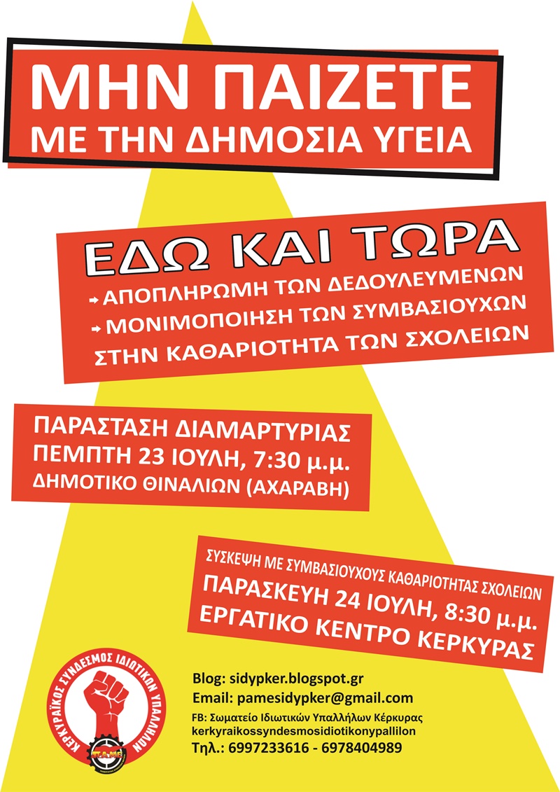 Καλούμε σε παράσταση διαμαρτυρίας την Πέμπτη 23 Ιούλη στις 7:30 μ.μ στο Δημοτικό Σχολείο Θιναλίων (Αχαράβη) και την Παρασκευή 24 Ιούλη στις 8:30 μ.μ. σε σύσκεψη στο Εργατικό Κέντρο Κέρκυρας.