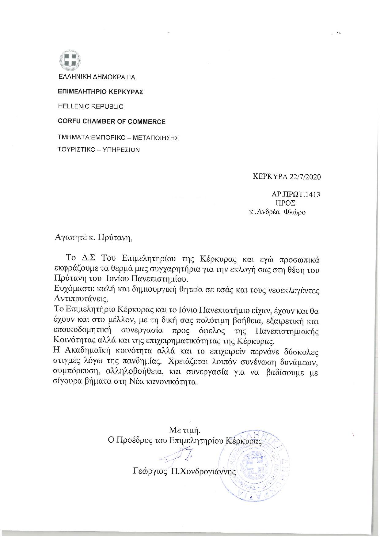 ΚΟΙΝΩΝΙΑΕΛΕΥΘΕΡΟΕΙΔΗΣΕΙΣ Συγχαρητήρια επιστολή Χονδρογιάννη στο νέο Πρύτανη του Ιονίου Πανεπιστημίου Συγχαρητήρια επιστολή του προέδρου του Επιμελητηρίου Κέρκυρας προς τον Ανδρέα Φλώρο. Last updated: 22/07/2020 14:31 CorfuPress.com Published: 22/07/2020 Share SHARE Συγχαρητήρια επιστολή του προέδρου του Επιμελητηρίου Κέρκυρας προς τον Ανδρέα Φλώρο. Ο Γ. Φλώρος στο τεχνικό επιτελείο της ΑΕΛ! Ο Πρύτανης του Ι.Π ομιλητής στην Ημερίδα «Γνωρίζω τα Πανεπιστήμια» στο ΑΠΘ O A. Φλώρος, στην τελετή αποφοίτησης του Λυκείου του Αγ. Δημητρίου στην Αστόρια Κάλεσμα Χονδρογιάννη σε… Κερκυραιόπουλα για τη νέα ΑΕΛ! ΑΕΛ: Με Χονδρογιάννη και στη Γ εθνική! Share This Article Facebook Whatsapp Whatsapp Email Copy Link Print Previous Article Είκοσι συλλήψεις σε αεροδρόμια των Ιονίων Next Article Νοσοκομείο: Πρόσκληση στις θρησκευτικές εκδηλώσεις για τον Εορτασμό του Αγίου Παντελεήμονος Δεν υπάρχουν Σχόλια Δεν υπάρχουν Σχόλια Αφήστε μια απάντηση Ακύρωση απάντησηςΗ ηλ. διεύθυνση σας δεν δημοσιεύεται. Τα υποχρεωτικά πεδία σημειώνονται με *Σχόλιο * Όνομα * Email * Ιστότοπος Αποθήκευσε το όνομά μου, email, και τον ιστότοπο μου σε αυτόν τον πλοηγό για την επόμενη φορά που θα σχολιάσω. ΑναζήτησηΑναζήτησηRecent PostsΌλα τα μάτια στον Θοδωρή, τον καπετάνιο μας! Τη Δευτέρα 22 Σεπτεμβρίου γιορτάζει… Σαν Σήμερα 22/9: Τα σημαντικότερα γεγονότα… Η πρόγνωση του καιρού Έφηβοι Ιονίου: Με περίπατο, συνεχίζουν στο Rising Stars! Recent CommentsΧωρίς σχόλια για εμφάνιση.