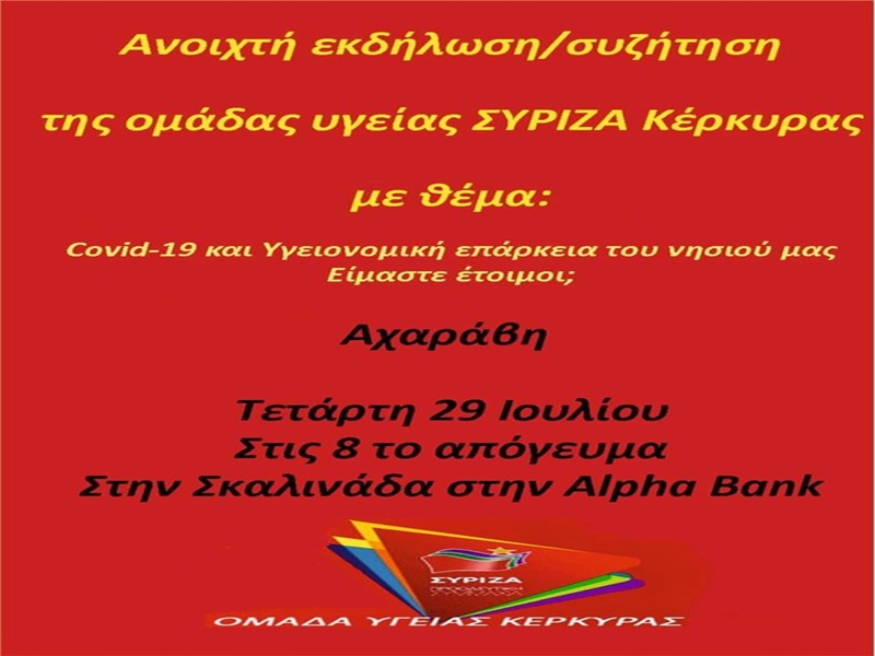 Ανοιχτή εκδήλωση ομάδας Υγείας ΣΥΡΙΖΑ Κέρκυρας με θέμα: Covid 19 και υγειονομική επάρκεια του νησιού μας. Είμαστε έτοιμοι;