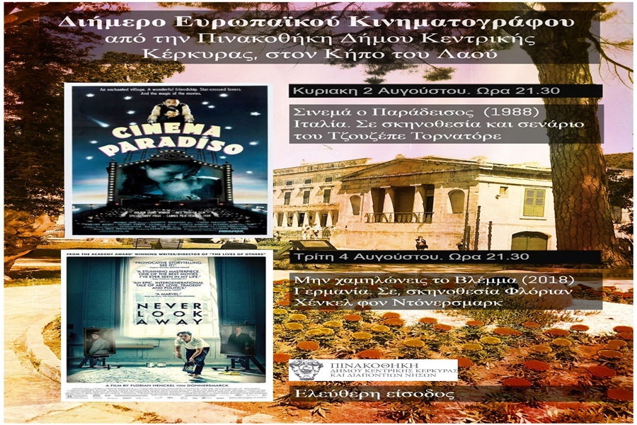 Διήμερο ευρωπαϊκού κινηματογράφου διοργανώνει η Πινακοθήκη Δήμου Κεντρικής Κέρκυρας & Διαποντίων Νήσων, στον Κήπο του Λαού, την Κυριακή 02 και την Τρίτη 04 Αυγούστου στις 9:30 μ.μ., με ελεύθερη είσοδο για το κοινό.