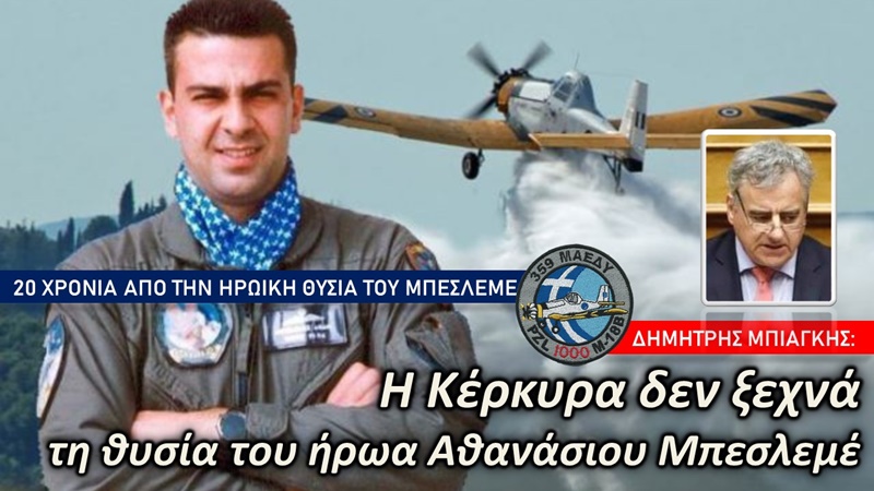 Συμπληρώνονται 20 χρόνια από τον αδόκητο χαμό του Λαμιώτη Υποσμηναγού Θανάση Μπεσλεμέ, που έπεσε στο καθήκον, δίνοντας μάχη με τις φλόγες στο νησί μας. Η Κέρκυρα δεν τον ξεχνά, θα συνεχίσει να τον τιμά όπως του αξίζει, και το μνημείο του στο σημείο που έλαβαν τέλος οι ριψοκίνδυνες και σωτήριες πτήσεις του, θα στέκει αγέρωχο για να μας θυμίζει ετούτη τη θυσία των ηρωικών ανθρώπων, που τολμούν, παρά τις αντιξοότητες, να τα βάλουν με τον πύρινο εχθρό και να μείνουν χαραγμένοι για πάντα στη μνήμη μας και την ιστορία.