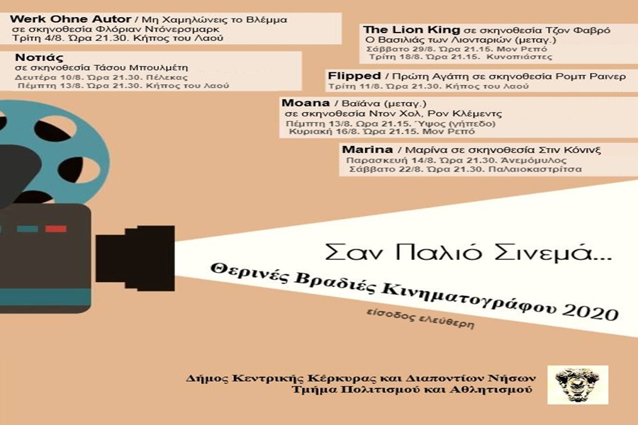 Σε αλλαγές του προγράμματος “Βραδιές θερινού κινηματογράφου ΣΑΝ ΠΑΛΙΟ ΣΙΝΕΜΑ” προχώρησε ο Δήμος Κεντρικής Κέρκυρας και Διαποντίων Νήσων, μετά τα νέα μέτρα για την αντιμετώπιση του κορονοϊού, που ανακοίνωσε η Ελληνική Κυβέρνηση, θέτοντας ως προτεραιότητα την ασφάλεια και την υγεία όλων.
