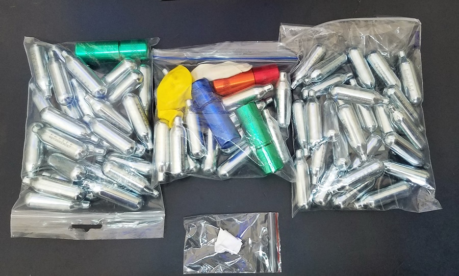 Κατασχέθηκαν συνολικά (65) αμπούλες αερίου γέλιου (Laugh Gas), συσκευές εκτόνωσης αερίου και μπαλόνια