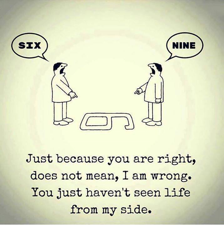 Δυο άνθρωποι παρατηρούν, ο καθένας από διαφορετική θέση, έναν αριθμό γραμμένο στον πάτωμα και διαφωνούν μεταξύ τους για τον αν ο αριθμός είναι το 6 ή το 9. Η λεζάντα από κάτω γράφει «το ότι έχεις εσύ δίκιο δε σημαίνει ότι εγώ έχω άδικο!».