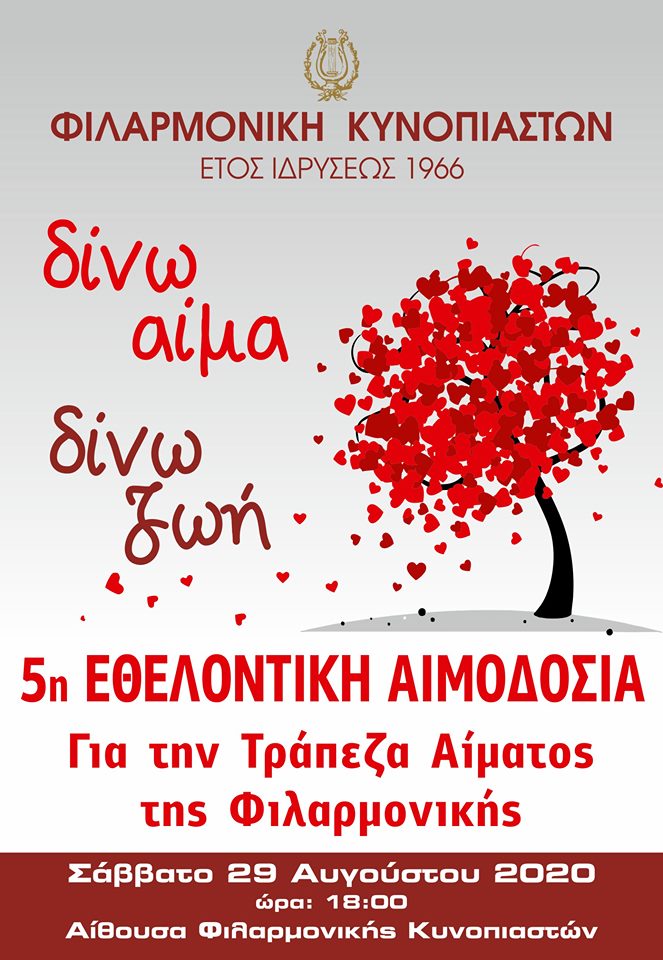Η Φιλαρμονική Κυνοπιαστών στο πλαίσιο της κοινωνικής ευαισθησίας και προσφοράς προς το συνάνθρωπο, διοργανώνει την ετήσια εθελοντική Αιμοδοσία για την ενίσχυση της Τράπεζας Αίματος που διατηρεί, το Σάββατο 29 Αυγούστου και ώρα 18.00 στο κτίριο της Φιλαρμονικής.