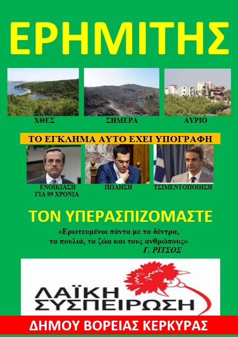 Τελειώνοντας και επειδή μια εικόνα αξίζει όσο χίλιες λέξεις, επισυνάπτουμε την αφίσα για τον Ερημίτη που κυκλοφόρησε η ΛΑ.ΣΥ. του Δήμου Β. Κέρκυρας και καλούμε τα λαϊκά στρώματα της Κέρκυρας να αγωνισθούν για να γυρίσουμε στην πρώτη φωτογραφία της αφίσας και όχι μοιρολατρικά να περιμένουμε την στιγμή που οι αστικές κυβερνήσεις και το μεγάλο κεφάλαιο θα μας σύρουν στη τρίτη φωτογραφία της αφίσας.