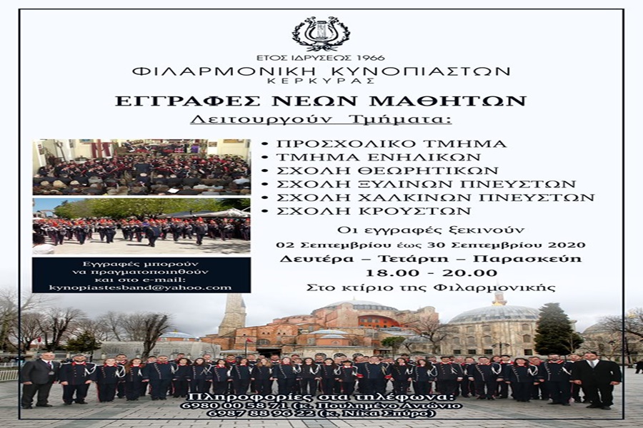Οι εγγραφές στις σχολές της Φιλαρμονικής Κυνοπιαστών ξεκινούν στις 02 Σεπτεμβρίου και θα διαρκέσουν έως 30 Σεπτεμβρίου 2020.