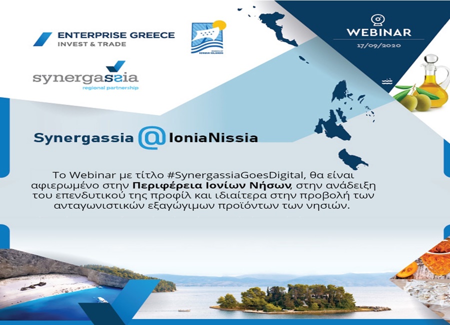 Το πρώτο διαδικτυακό Webinar με τίτλο “Synergassia@IoniaNisia-GR” διοργανώνουν την Πέμπτη 17 Σεπτεμβρίου 2020, η Περιφέρεια Ιονίων Νήσων και η Enterprise Greece.