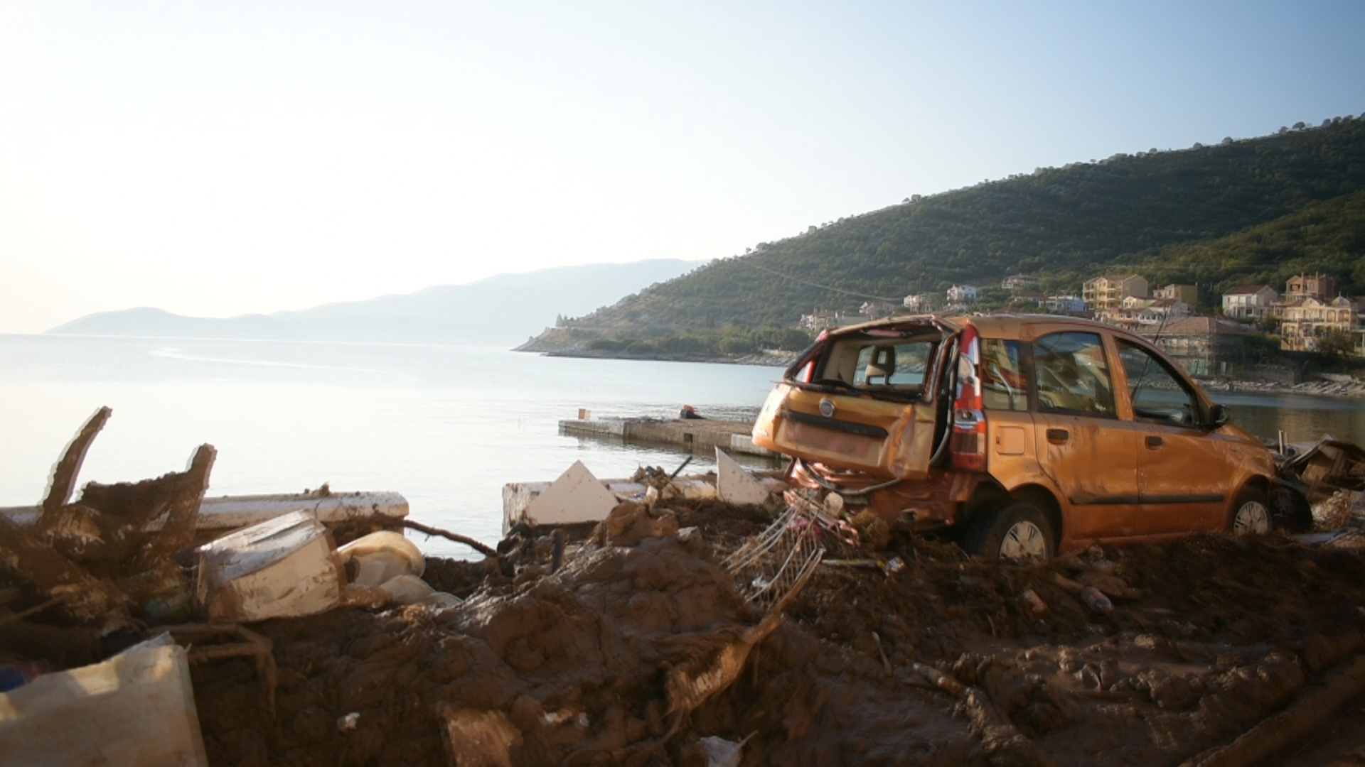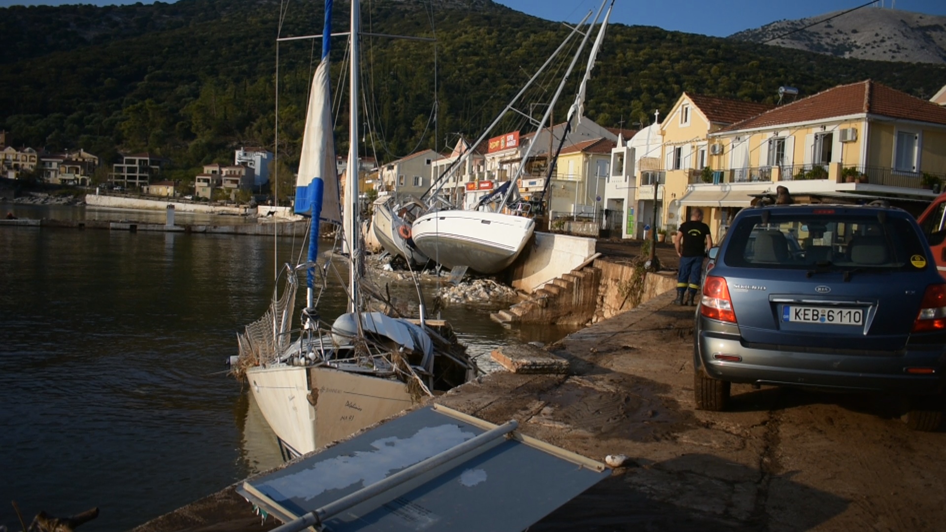 Βυθισμένα σκάφη και άλλα καρφωμένα στον κυματοθραύστη, στο λιμανάκι της Αγίας Ευθυμίας, κατεστραμμένο οδόστρωμα κατά μήκος του παραλιακού της δυτικής Κεφαλονιάς, καταπλακωμένα αυτοκίνητα, διαλυμένες επιχειρήσεις, είναι οι εικόνες που κυριαρxούν μαζί με την απόγνωση ενώ εκσκαφείς και κλιμάκια της Πυροσβεστικής και της Πολιτικής Προστασίας, ξεκίνησαν την προσπάθεια αποκατάστασης.