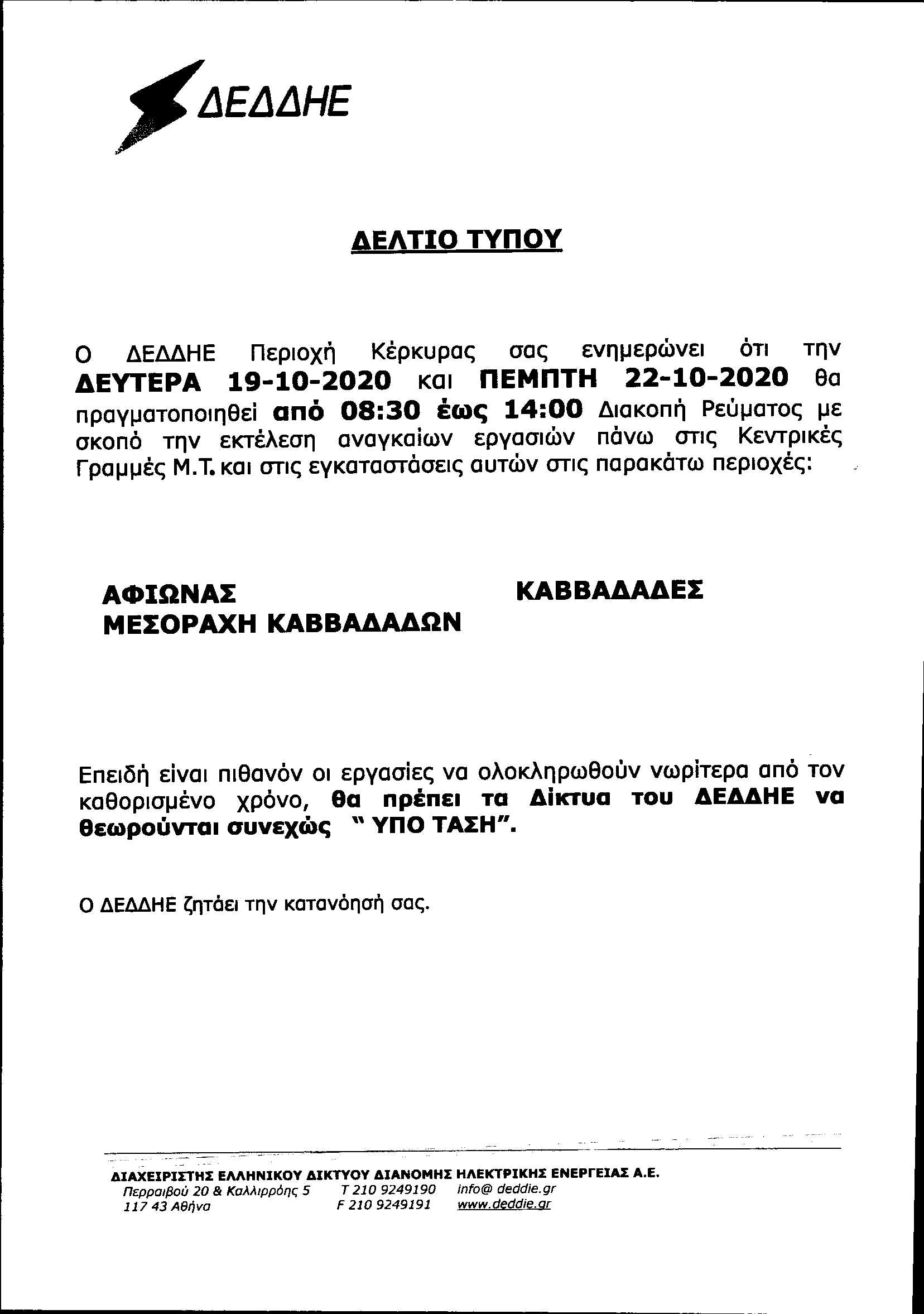ΚΟΙΝΩΝΙΑΕΛΕΥΘΕΡΟΕΙΔΗΣΕΙΣ Πάλι, διακοπές ρεύματος σε Αφιώνα και Καββαδάδες Συνέχεια των εργασιών του ΔΕΔΔΗΕ και νέες διακοπές ρεύματος στις περιοχές της βόρειας Κέρκυρας. Last updated: 16/10/2020 15:57 CorfuPress.com Published: 16/10/2020 Share SHARE Συνέχεια των εργασιών του ΔΕΔΔΗΕ και νέες διακοπές ρεύματος στις περιοχές της βόρειας Κέρκυρας. Διακοπή ρεύματος τη Δευτέρα-Δείτε που Που θα γίνει διακοπή ρεύματος την Τετάρτη Που θα γίνει διακοπή ρεύματος την Τετάρτη Που θα γίνουν προγραμματισμένες διακοπές ρεύματος το διάστημα 23-25 Αυγούστου Έρχεται διακοπή ρεύματος στη Βόρεια Κέρκυρα Share This Article Facebook Whatsapp Whatsapp Email Copy Link Print Previous Article ΠΙΝ: Εγκρίθηκε η μελέτη αντιπλημμυρικών έργων για την προστασία της Πύλαρου Next Article Εθιμοτυπική επίσκεψη της Διεθνούς Λέσχης Λάιονς στην Υδραίου Δεν υπάρχουν Σχόλια Δεν υπάρχουν Σχόλια Αφήστε μια απάντηση Ακύρωση απάντησηςΗ ηλ. διεύθυνση σας δεν δημοσιεύεται. Τα υποχρεωτικά πεδία σημειώνονται με *Σχόλιο * Όνομα * Email * Ιστότοπος Αποθήκευσε το όνομά μου, email, και τον ιστότοπο μου σε αυτόν τον πλοηγό για την επόμενη φορά που θα σχολιάσω. ΑναζήτησηΑναζήτησηRecent PostsΌλα τα μάτια στον Θοδωρή, τον καπετάνιο μας! Τη Δευτέρα 22 Σεπτεμβρίου γιορτάζει… Σαν Σήμερα 22/9: Τα σημαντικότερα γεγονότα… Η πρόγνωση του καιρού Έφηβοι Ιονίου: Με περίπατο, συνεχίζουν στο Rising Stars! Recent CommentsΧωρίς σχόλια για εμφάνιση.