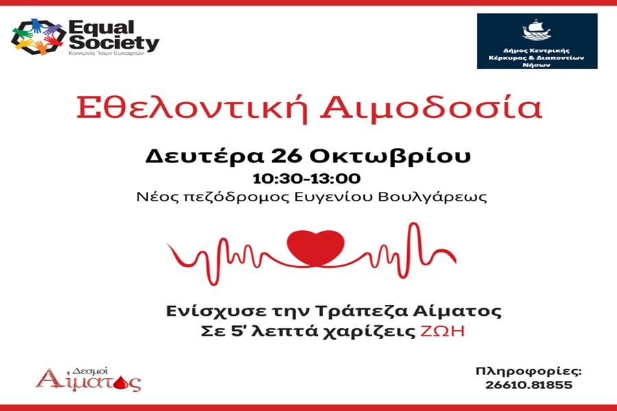 Ο Δήμος Κεντρικής Κέρκυρας και Διαποντίων Νήσων σε συνεργασία με την Equal Society διοργανώνει εθελοντική αιμοδοσία την Δευτέρα 26 Οκτωβρίου 2020 από τις 10:30 έως τη 13.00 στον Νέο πεζόδρομο Ευγενίου Βουλγάρεως.