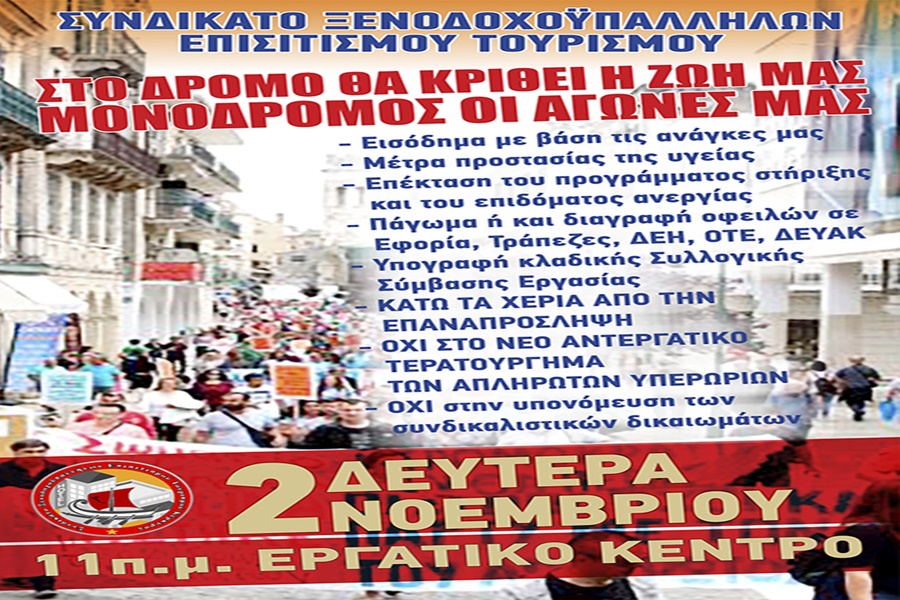 Σε απεργία και πορεία καλεί το Συνδικάτο Ξενοδοχοϋπαλλήλων Επισιτισμού Τουρισμού τα μέλη του τη Δευτέρα 2 Νοεμβρίου στις 11:00.
