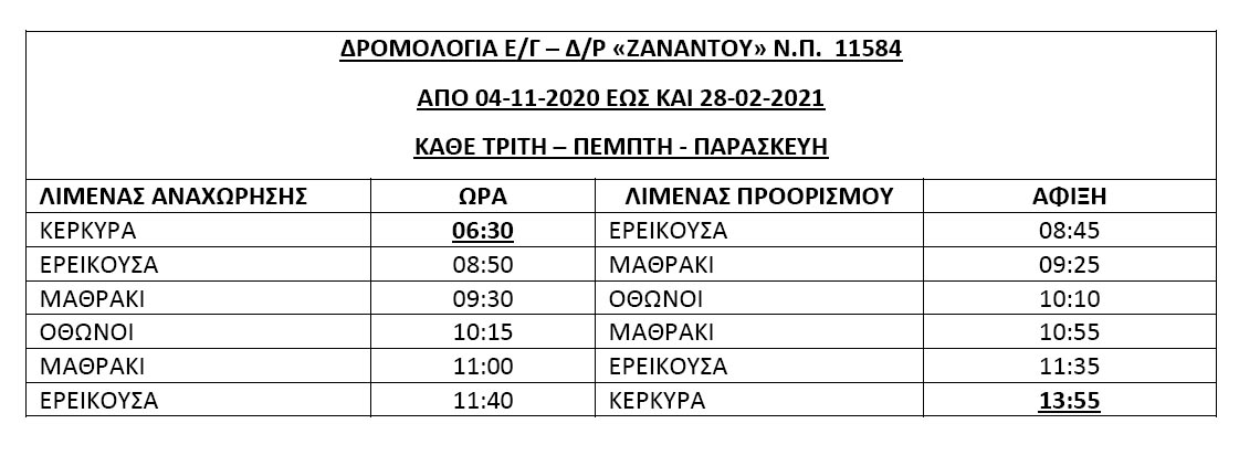Προσέθεσε, δε: “Η άγονη γραμμή Κέρκυρα- Διαπόντια θα εξυπηρετεί κάθε Τρίτη – Πέμπτη – Παρασκευή και η αντίστοιχη από Άγιο Στέφανο κάθε Δευτέρα – Τετάρτη – Σάββατο. Στη σχετική επιστολή της κ. Δημάρχου, στην οποία αναφέρθηκα στην χθεσινή μου ενημέρωση, καταγράφεται το αίτημα, το πλοίο της άγονης γραμμής από Κέρκυρα να παραμένει για τουλάχιστον μιάμιση ώρα στο λιμάνι των Οθωνών”.