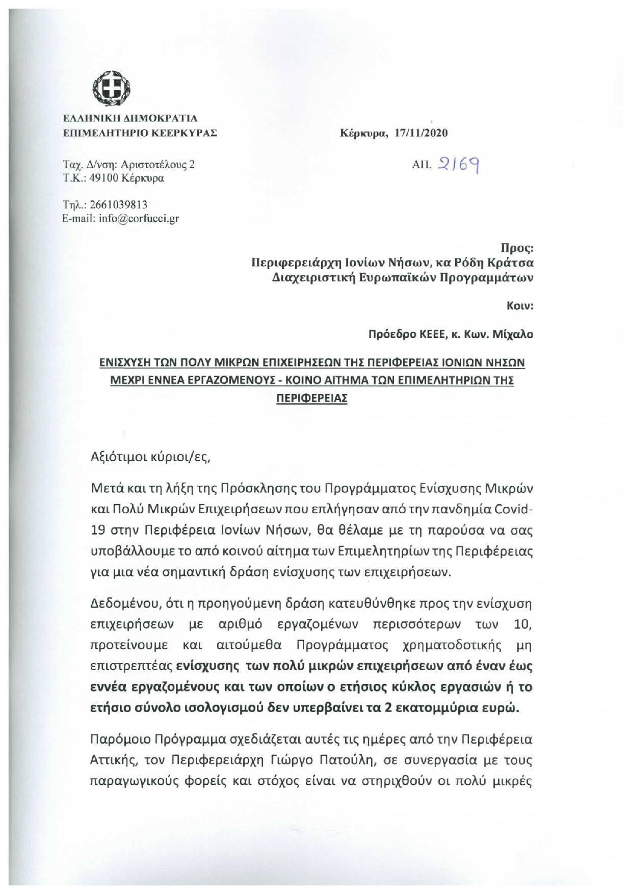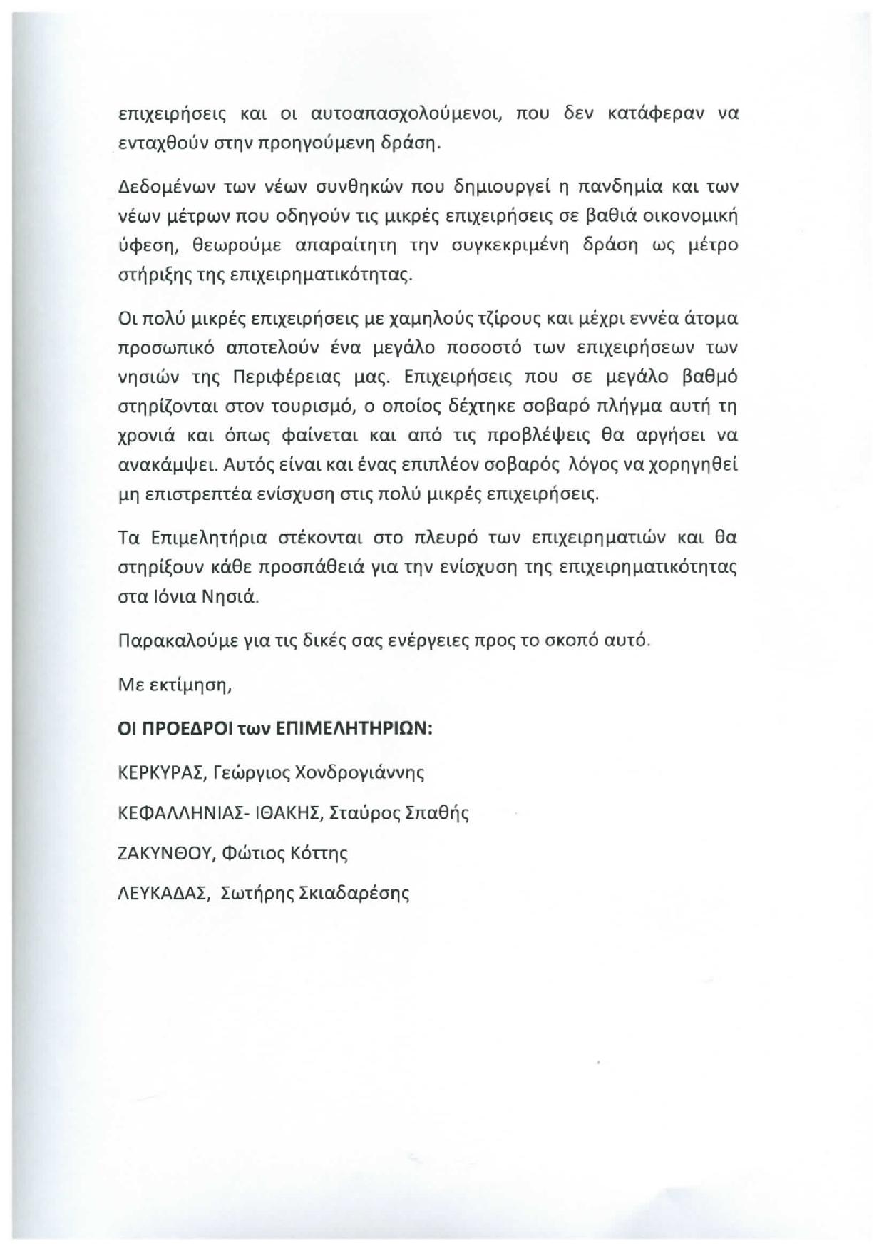 Κοινή επιστολή των Προέδρων των Επιμελητηρίων της Περιφέρειας Ιονίων Νήσων, προς την Ρόδη Κράτσα – Τσαγκαροπούλου, με αίτημα για την ενίσχυση των πολύ μικρών επιχειρήσεων της Περιφέρειας Ιονίων Νήσων μέχρι εννέα εργαζομένους.