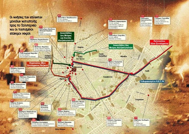 1. Σπυρίδων Κοντομάρης του Αναστασίου, 57 ετών, δικηγόρος (πρώην βουλευτής Κερκύρας της Ένωσης Κέντρου), κάτοικος Αγίου Μελετίου, Αθήνα. Στις 16.11.1973, γύρω στις 20.30-21.00, ενώ βρισκόταν στη διασταύρωση οδών Γεωργίου Σταύρου & Σταδίου, προσβλήθηκε από δακρυγόνα αέρια που έρριχνε η Αστυνομία κατά των διαδηλωτών, με αποτέλεσμα να υποστεί έμφραγμα του μυοκαρδίου. Μεταφέρθηκε στο Σταθμό Πρώτων Βοηθειών του Ε.Ε.Σ., όπου διαπιστώθηκε ο θάνατος του.