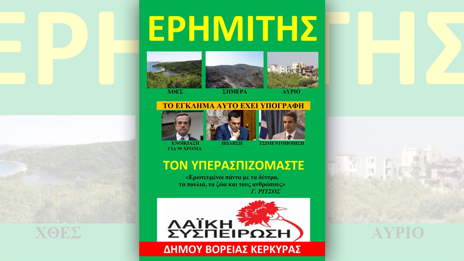 Στη Φαιακία των ημερών μας, εφέτος, τον περασμένο Ιούλιο, η «Λαϊκή Συσπείρωση Βόρειας Κέρκυρας» κάλεσε τον κόσμο της σε συγκέντρωση διαμαρτυρίας για την επαπειλούμενη τσιμεντοποίηση στην απίστευτου κάλλους περιοχή Ερημίτης, στη διάρκεια επίσκεψης του πρωθυπουργού Κυριάκου Μητσοτάκη, με σύνθημα-όνειρο εμπνευσμένο απ’ αυτόν.