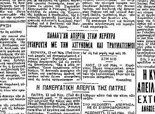 Η μεγάλη απεργία του 1936 και το αίμα των εργατών της Θεσσαλονίκης, ας προσθέσουμε εδώ, είχαν ξεσηκώσει την Κέρκυρα. Τις 13 Μαΐου 1936 ξεχύθηκαν στους δρόμους της πόλης χιλιάδες απεργοί εργάτες, υπάλληλοι και επαγγελματίες, καθώς και αγρότες. Είχαν καταγραφεί 35 τραυματίες σε συγκρούσεις με αστυνομικούς και στρατιώτες. Για να ακολουθήσουν νέες συγκρούσεις την επόμενη ημέρα, στη διάρκεια γενικής απεργίας και εκδήλωσης που εκτιμήθηκε ότι συγκέντρωσε 12.000 λαού σε διαμαρτυρία «διά τας αιματηράς σκηνάς της Θεσσαλονίκης», όπως έγραψε η εφημερίδα «Κερκυραϊκόν Βήμα». Έγραψε επίσης ο «Ριζοσπάστης» στην Αθήνα: «Παλλαϊκή απεργία στην Κέρκυρα – Σύγκρουση με την Αστυνομία και τραυματισμοί».