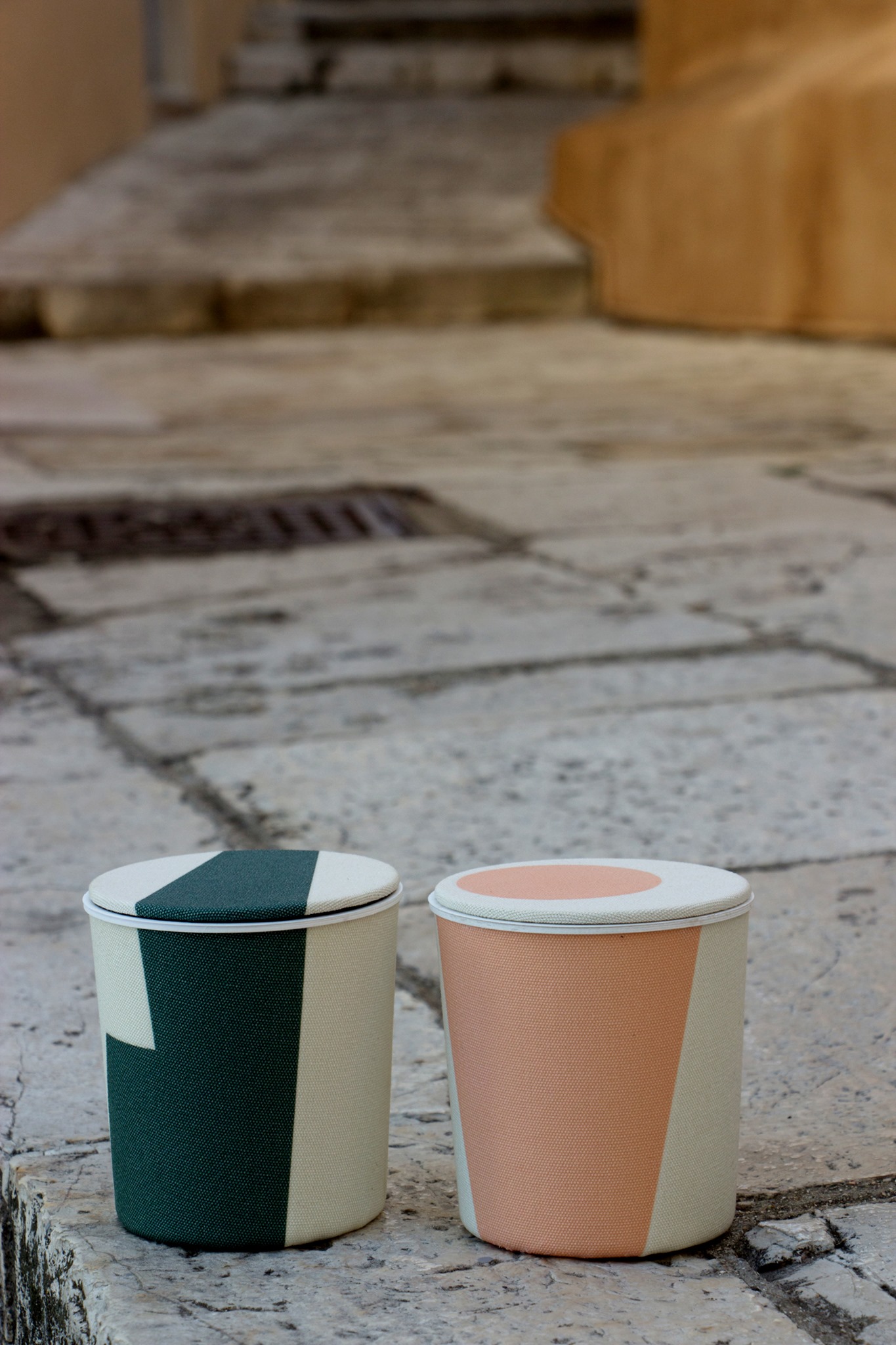Κυρίως χρησιμοποιούμε ξύλο, μπρούτζο και ύφασμα. Το τελευταίο είναι και ένα από τα βασικότερα υλικά του design μας και αποτελεί την βάση πάνω στην οποία τυπώνουμε τα δικά μας σχέδια. Οι πρώτες ύλες των κεριών αποτελούνται είτε από σόγια, είτε από ελληνικό κερί μέλισσας, τις οποίες εμπλουτίζουμε με μεσογειακά αρώματα.