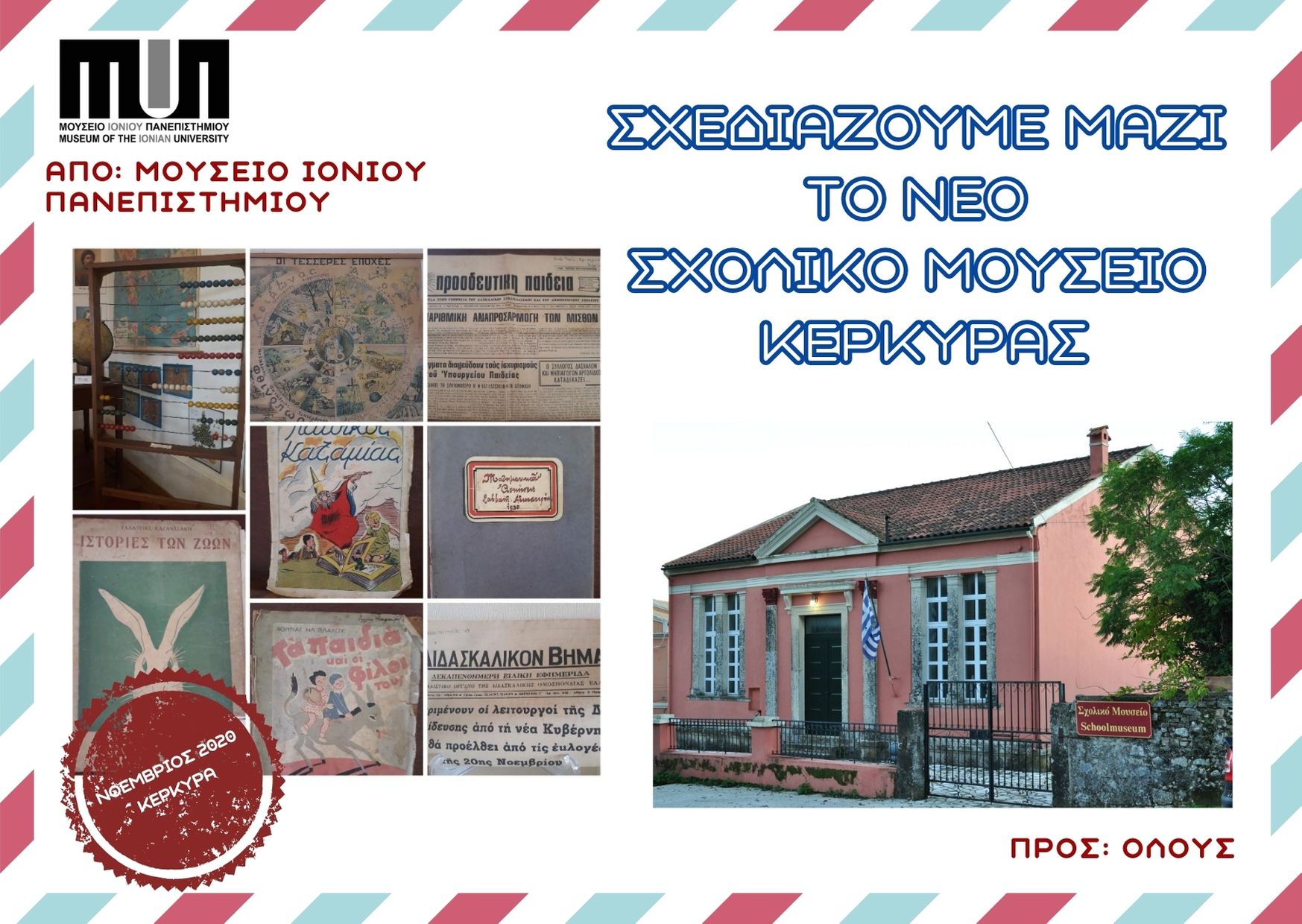 Το Μουσείο του Ιονίου Πανεπιστημίου σας προσκαλεί να συμμετέχετε στη διαδικτυακή δράση «Σχεδιάζουμε μαζί το Σχολικό Μουσείο Κέρκυρας» που έχει ως στόχο την επανέκθεση της μόνιμης συλλογής που παρουσιάζεται στο παλαιό σχολείο Σκριπερού. Επιδίωξη του Πανεπιστημιακού Μουσείου είναι μέσα από την ενεργή συμμετοχή και την εμπλοκή της τοπικής κοινωνίας στη λειτουργία του, να σχεδιαστεί και να υλοποιηθεί η νέα μόνιμη έκθεση στο Σχολικό Μουσείο, το οποίο αποτελεί μια εκ των τριών συλλογών του Μουσείου Ιονίου Πανεπιστημίου.