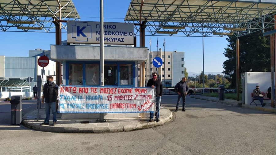 Η απεργιακή συγκέντρωση της ΕΛΜΕ Κέρκυρας πραγματοποιήθηκε έξω από την πύλη του Νοσοκομείου για να ενώσουμε τις φωνές μας, με αυτές των υγειονομικών, για τις τεράστιες ελλείψεις σε ιατρικό και νοσηλευτικό προσωπικό, για το ότι η κυβέρνηση δεν αξιοποίησε το χρόνο που της δόθηκε το προηγούμενο διάστημα για την ενίσχυση του δημόσιου συστήματος Υγείας, αφήνοντας απροστάτευτους τόσο τους ασθενείς όσο και τους εργαζόμενους και επενδύοντας στη λογική της «ατομικής ευθύνης».