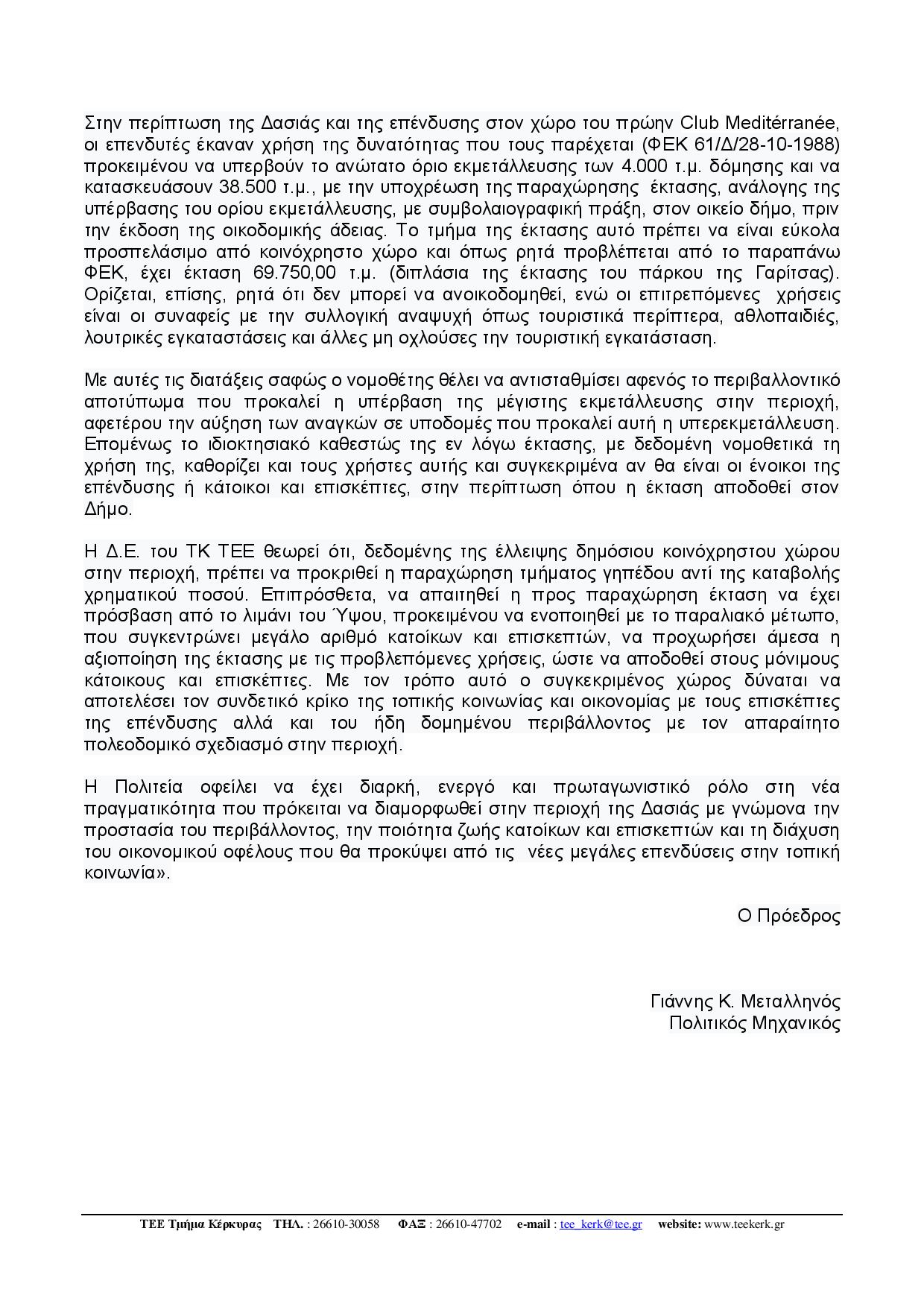 "Με τον τρόπο αυτό ο συγκεκριμένος χώρος δύναται να αποτελέσει το συνδετικό κρίκο της τοπικής κοινωνίας και οικονομίας με τους επισκέπτες της επένδυσης" σημειώνει το ΤΕΕ Κέρκυρας.