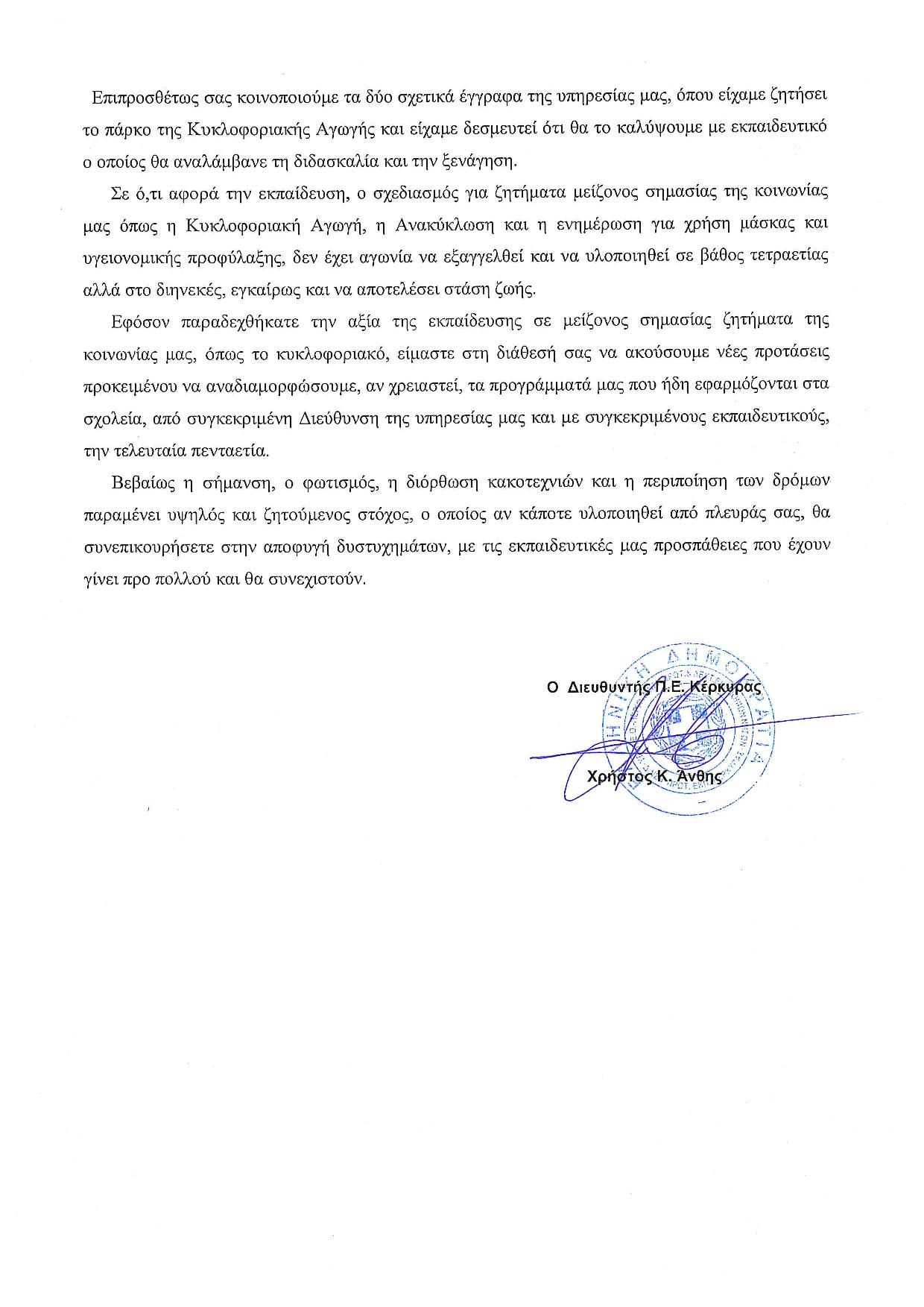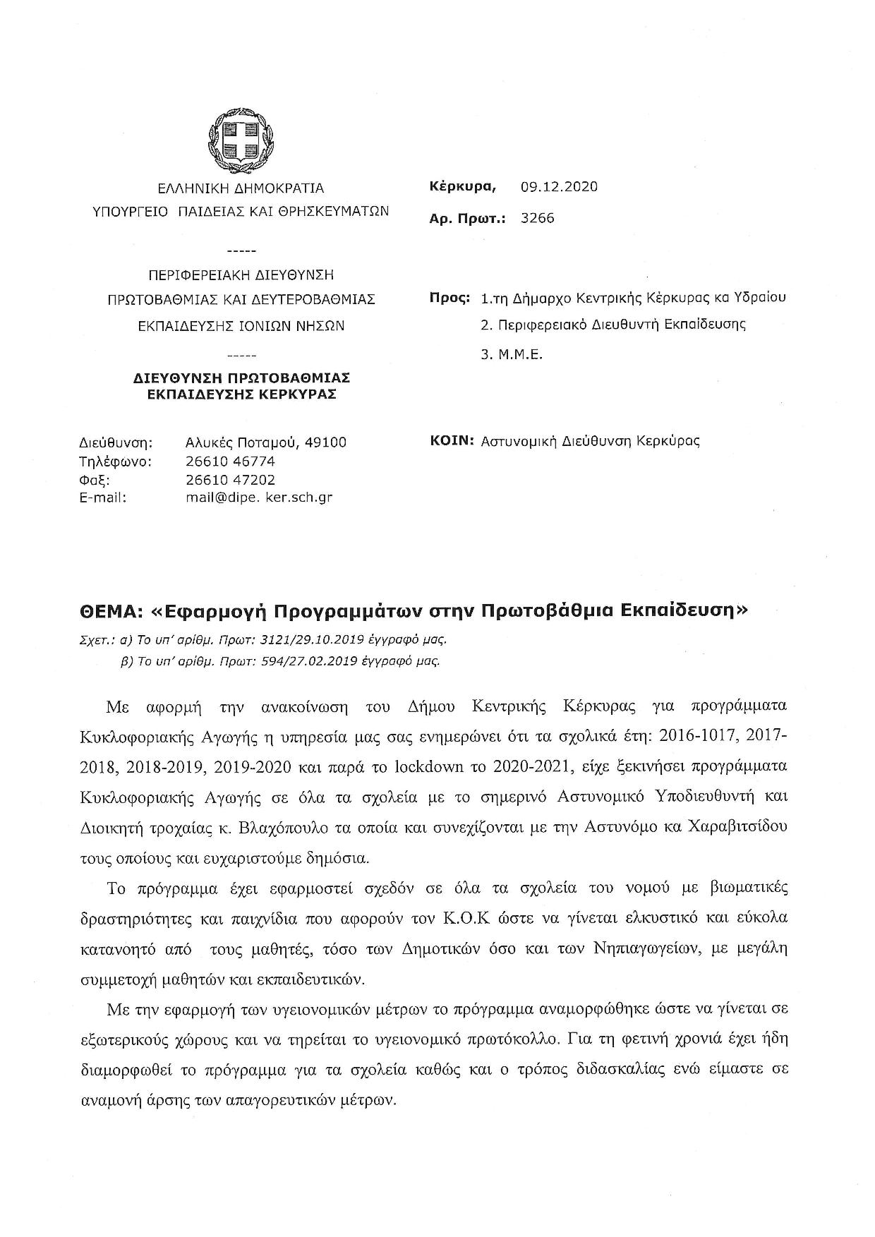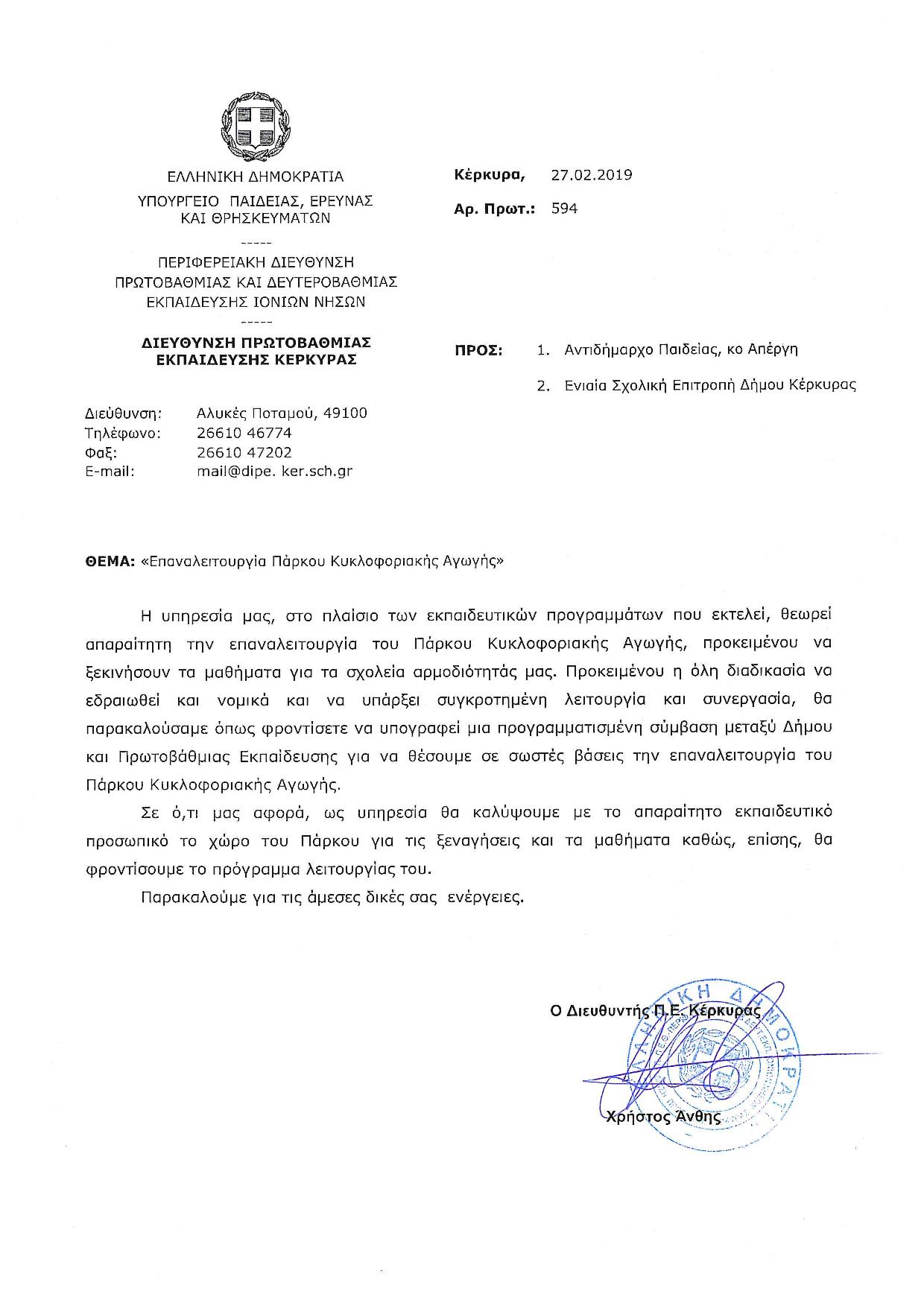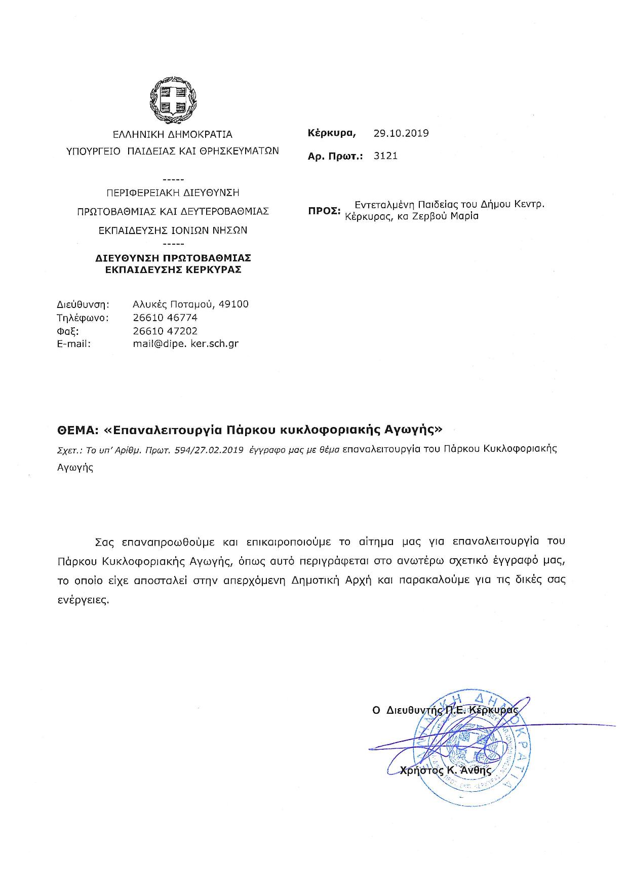 Επιστολή του Δ/ντη Πρωτοβάθμιας Εκπαίδευσης προς τη Δήμαρχο Κεντρικής Κέρκυρας και τον Περιφερειακό Δ/ντη Εκπαίδευσης.