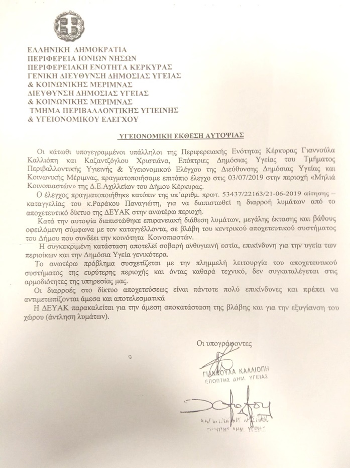 Σας επισυνάπτουμε και έγγραφο της Περιφέρειας Ιονίων Νήσων και συγκεκριμένα του τμήματος Δημόσιας Υγείας όπου κατόπιν αυτοψίας που έγινε από ειδικό κλιμάκιο στις 3/7/2019, επιβεβαιώνουν ότι υπάρχουν αυτές οι επιφανειακές διαρροές και κρίνονται πολύ επικίνδυνες εστίες μόλυνσης για την υγεία των περιοίκων.